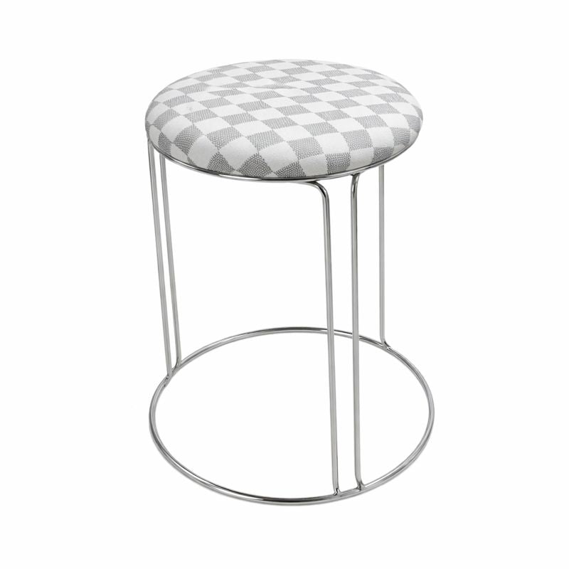 Petite Lightweight White Gray Pattern Stool with Silver Frame, Fabric Seat Compact Living Room Accent Home Decor