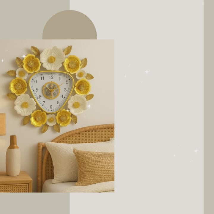 Transform your living space with a timepiece that is also a work of art. This stunning designer wall clock is more than just a way to tell time; it's a captivating statement piece that brings luxury and elegance to any room. The unique design features a modern, rounded-triangle clock face, beautifully framed by an intricate wreath of 3D metal flowers. Finished in sophisticated matte white and lustrous gold, the floral and leaf details create a striking botanical display that adds texture and depth to your wall. At the center, an exposed gear mechanism (non-moving, for aesthetic) adds a touch of industrial chic, creating a perfect balance between soft nature and modern geometry. Crafted from high-quality, durable metal, this large wall clock is built to last. Its quartz movement ensures functionality, making it perfect for bedrooms, home offices, or studies. Whether you're looking to create a stunning focal point in your living room, dining area, or entryway, this gold and white floral clock is the perfect finishing touch for your modern, glam, or contemporary home decor.