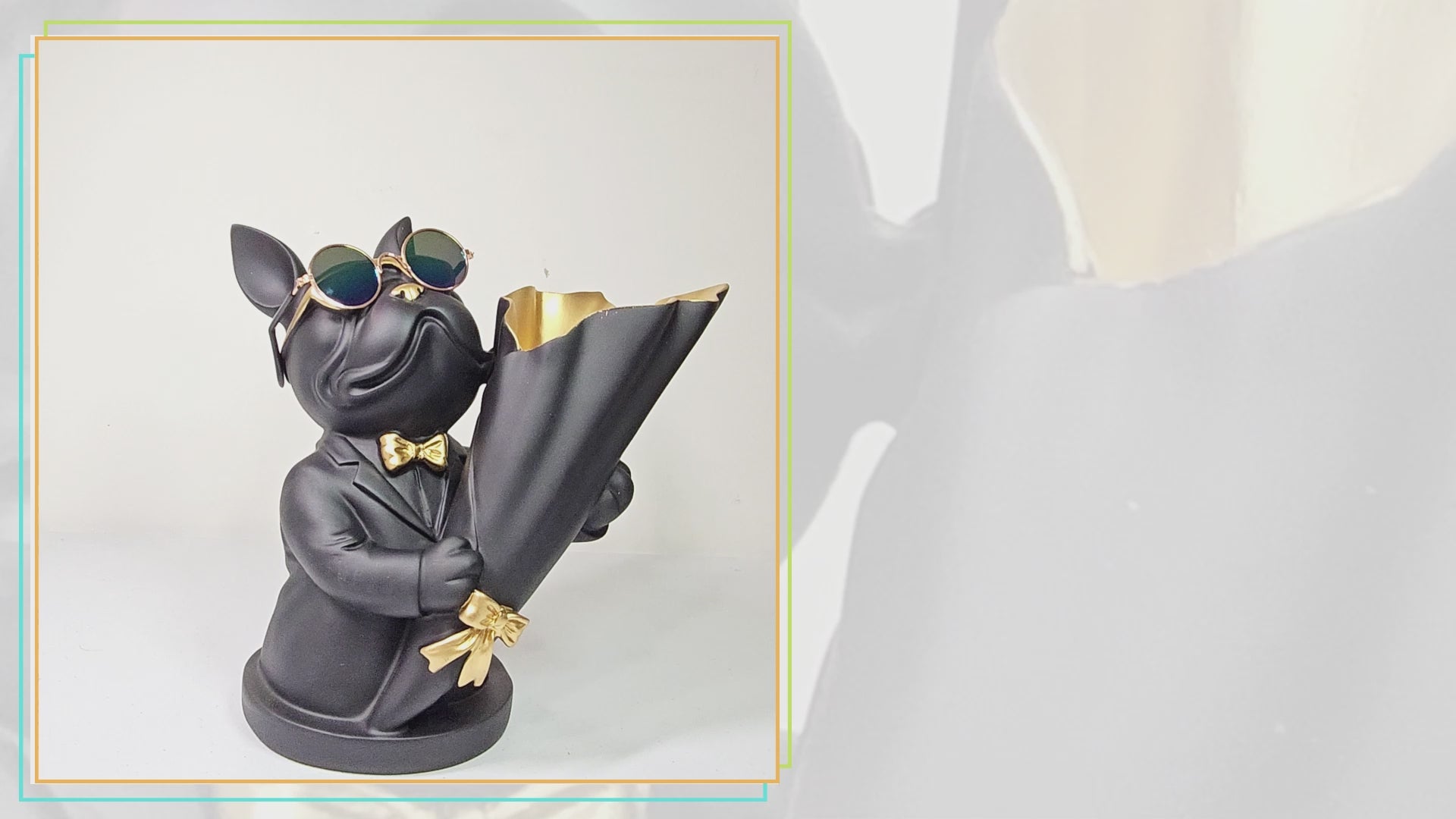 Let that sweet and adorable puppy love dazzle in your home or office with this cute Pug Statue with Bouquet Holder. This adorable dog statue is perfect for adding cuteness to your home or office, no matter your style - whether it's old-fashioned or modern. This rose vase is made of strong polyresin and is about 9 inches (22 cm) tall. This special dog statuary is wearing hippie sunglasses that makes it a feel good entryway table decor, mantle decor, coffee table centerpiece, or decor for bookshelves. The black color of this dog sculpture goes well with any other color schemes for any interior style including minimalist, contemporary, modern, industrial, and more. Let the flower vase bring your once bleak space to life, especially when placed with beautiful floral arrangements. Please note that the decorative vase is unable to hold water. You can display it right out of the box with or without flowers; or you can place a bouquet of roses, dried flowers, or even fake flowers. It's a great dog themed gift or housewarming gift, so go ahead and share your love for your furry friends with this sculpture of a dog.