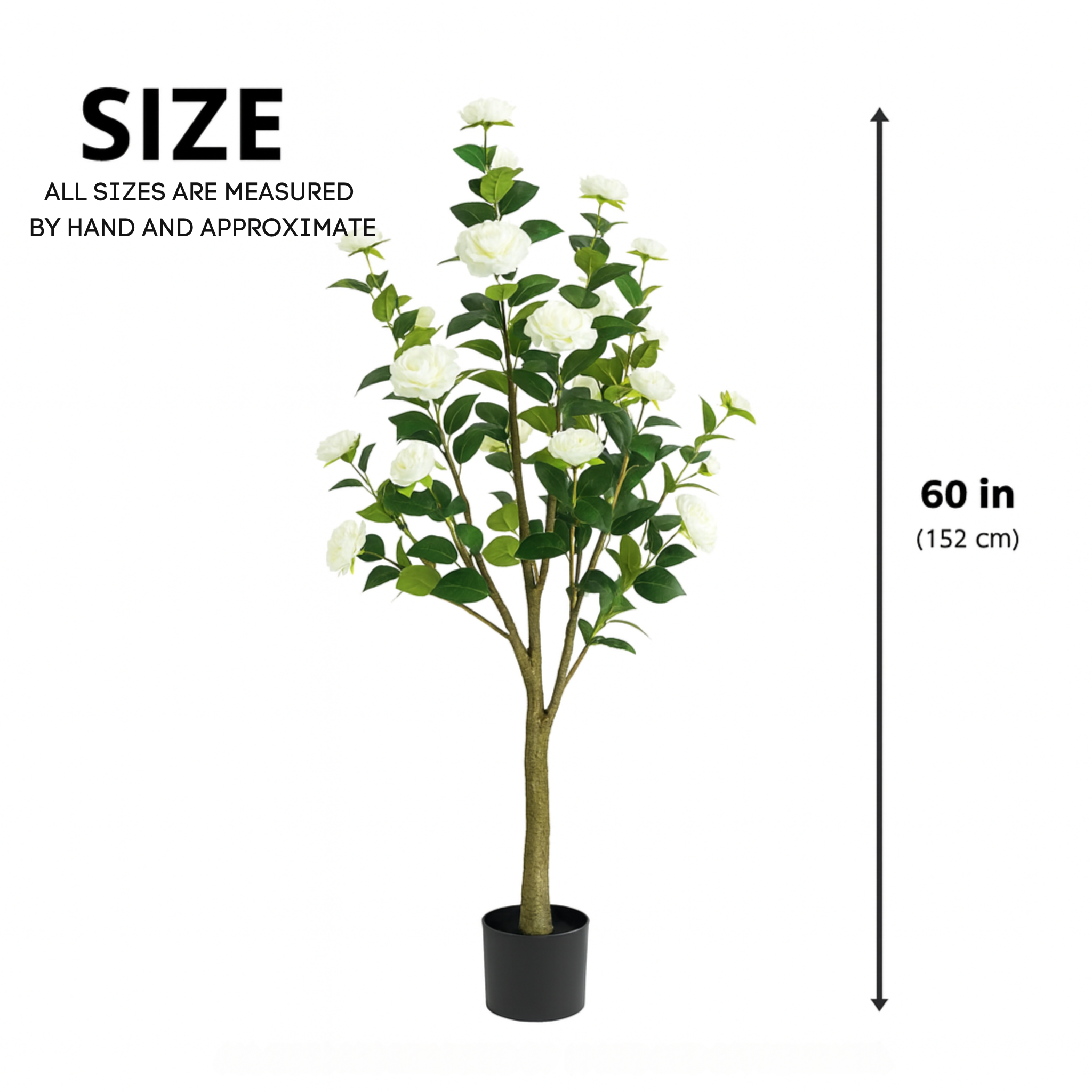 This graceful 5 ft tall Artificial Camellia Tree features delicate white blooms and lush green foliage.  It offers a nearly natural touch, from the textured leaves and sturdy trunk to the elegant branches. Set in a stable black cement base, this decorative tall plant is timeless and charming for your office, patio, porch, living room, or dining area. Built to last and sturdy, it’s an ideal centerpiece that requires no maintenance - perfect for busy lifestyles. This camellia tree also makes a thoughtful housewarming or special occasion gift. NOTE: Apply UV-resistant spray when placed outdoors to protect the artificial plant from extreme heat.