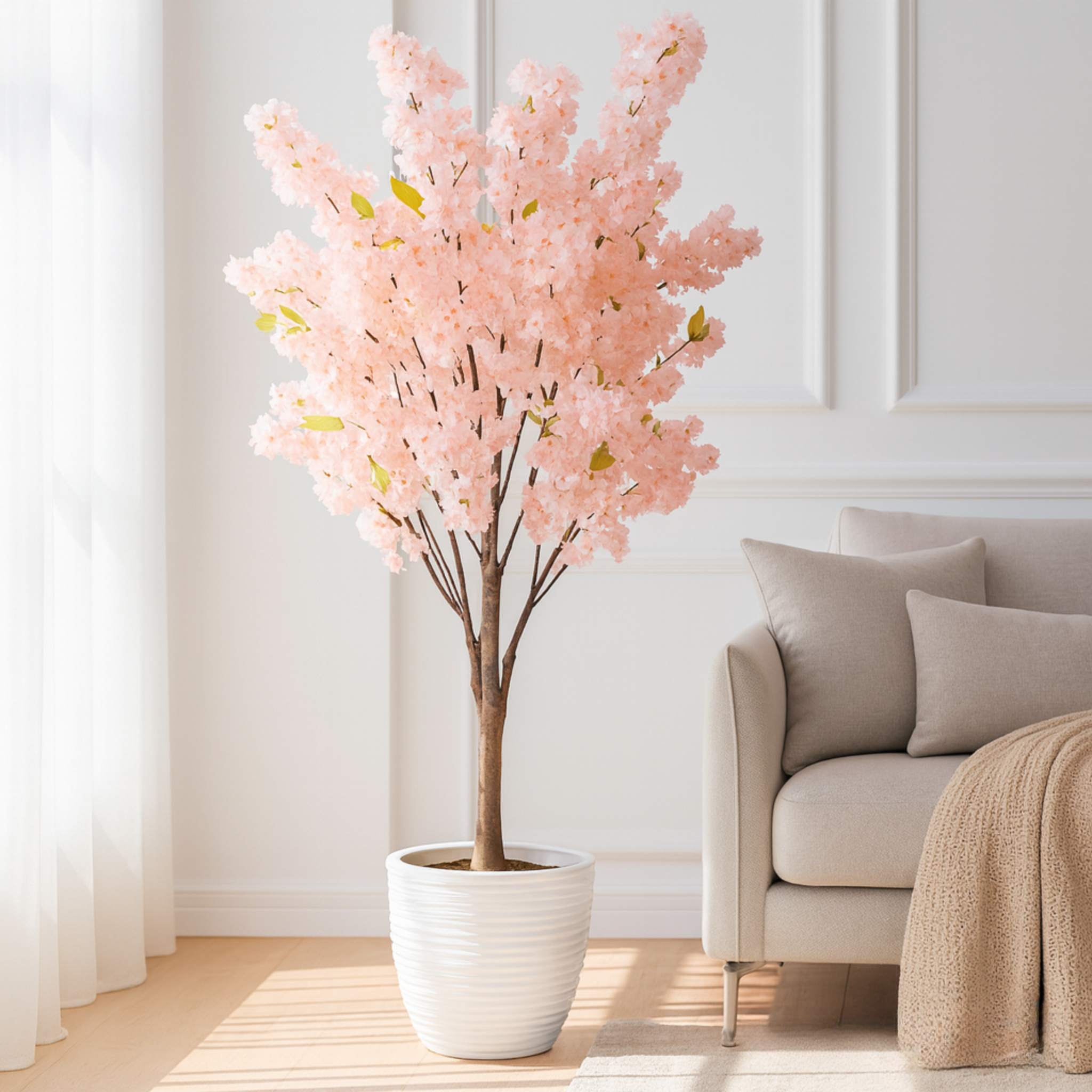 Bring timeless elegance into your space with this Large Artificial Tree - a stunning 5 ft tall Baby Pink Sichuan Cherry Blossom that transforms any setting into a serene botanical haven. Designed to impress, this faux plant features realistic, lifelike white blossoms, a detailed plastic trunk, and rich lifelike leaves, all anchored in a cement base pot. Whether enhancing your indoor modern decor or adding a welcoming touch to your outdoor patio or front porch, this nearly natural decorative tree delivers effortless beauty year-round - without the maintenance. Perfect for home, office, or room decoration, this fake cherry blossom tree is the ideal nature-inspired modern style, bringing warmth and sophistication to any environment. NOTE: If you wish to display this artificial tree outside, spray with UV-resistant spray to protect from harsh weather conditions.