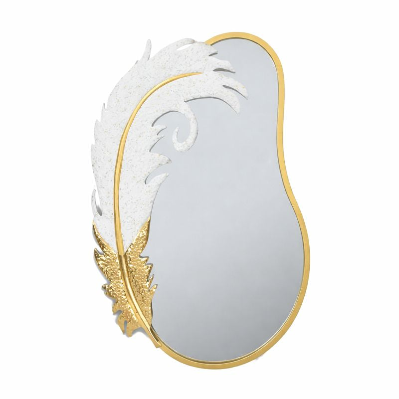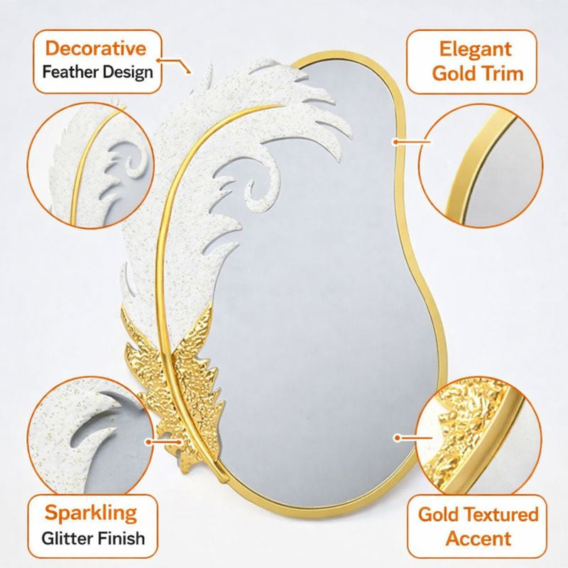 Decorative Metal Wall Mirror, Gold with White Feather, Glitter, 89 cm Asymmetrical Mirror Home Office Girl's Room Decor Gift