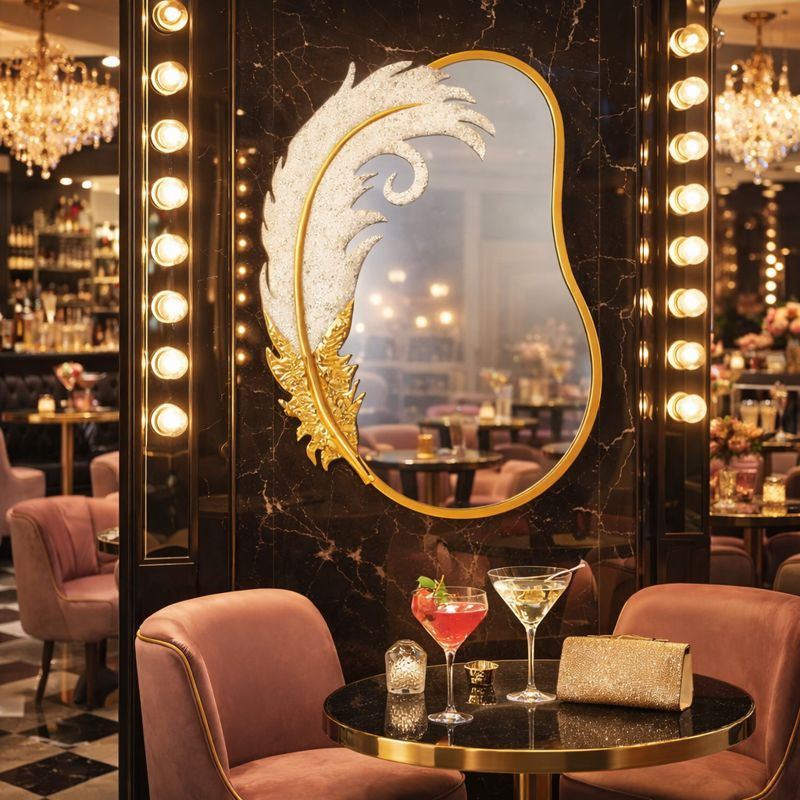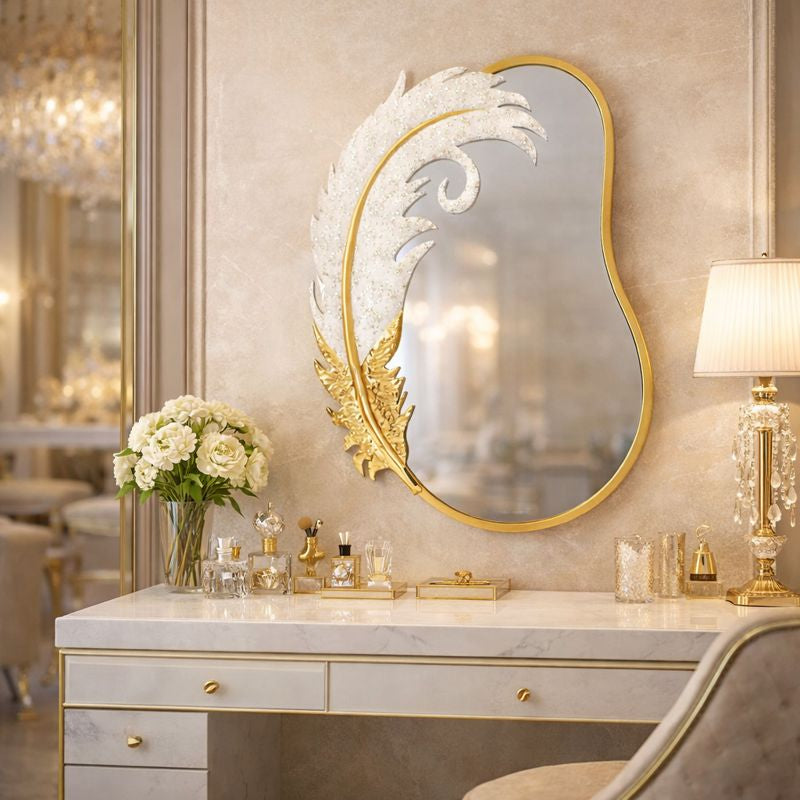 Bring a touch of Hollywood glam to your home with the Decorative Feather Design Decorative Wall Mirror. This stunning piece combines an organic, asymmetrical silhouette with a masterfully crafted metal feather overlay. The crisp white and radiant gold finish creates a sophisticated focal point that elevates any room, from modern entryways to chic glam bedrooms.