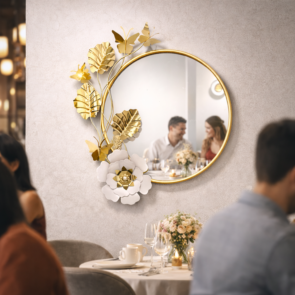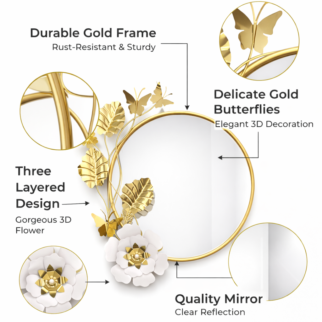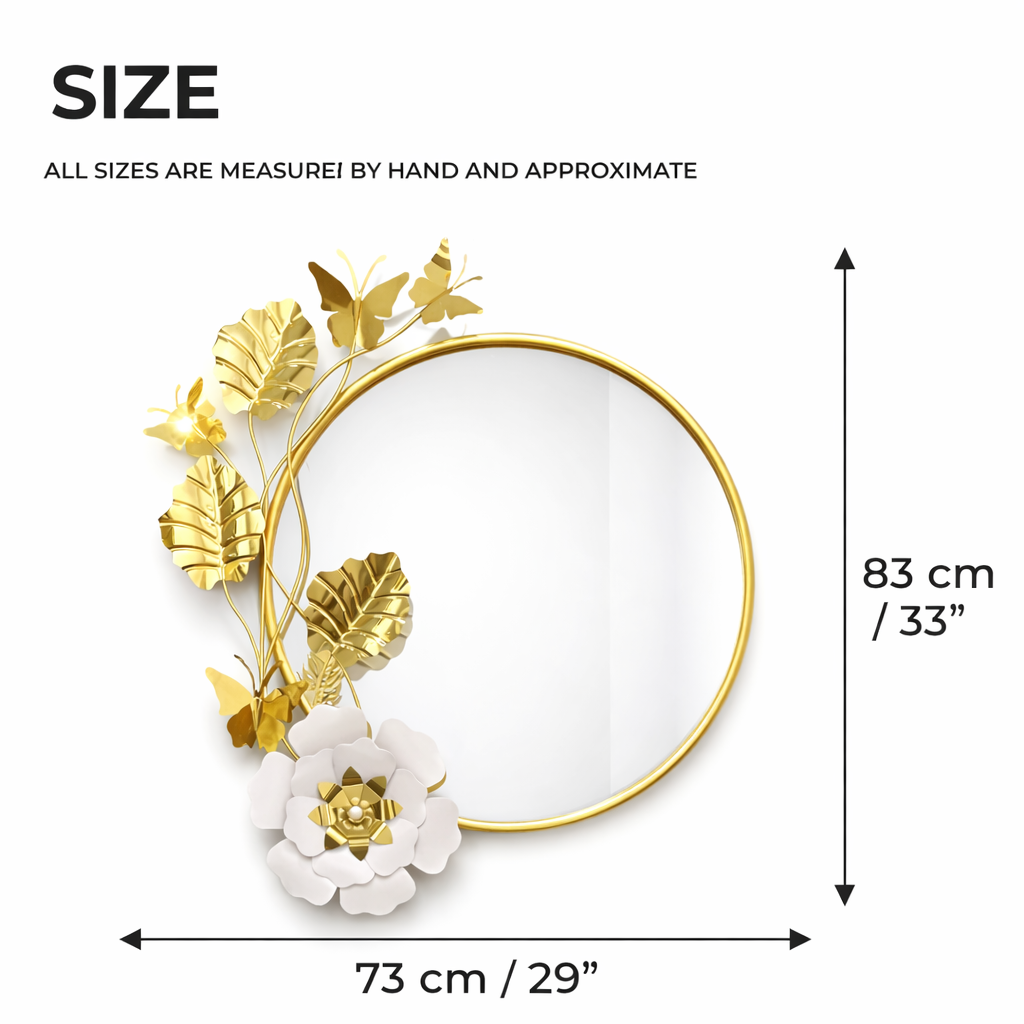 This striking decorative mirror will instantly transform your walls to modern elegance. It combines a sleek, circular silhouette with an artistic flourish of white leaves, delicate butterflies, and a dimensional white blossom. It’s more than a mirror; it’s a functional piece of art that brightens your entryway, bedroom, loving room, bathroom, or vanity. Whether you're looking to anchor your entryway, add flair to a bedroom, or create a focal point in your living room, this 83 cm tall mirror delivers sophisticated charm with a high-end, metallic finish.
