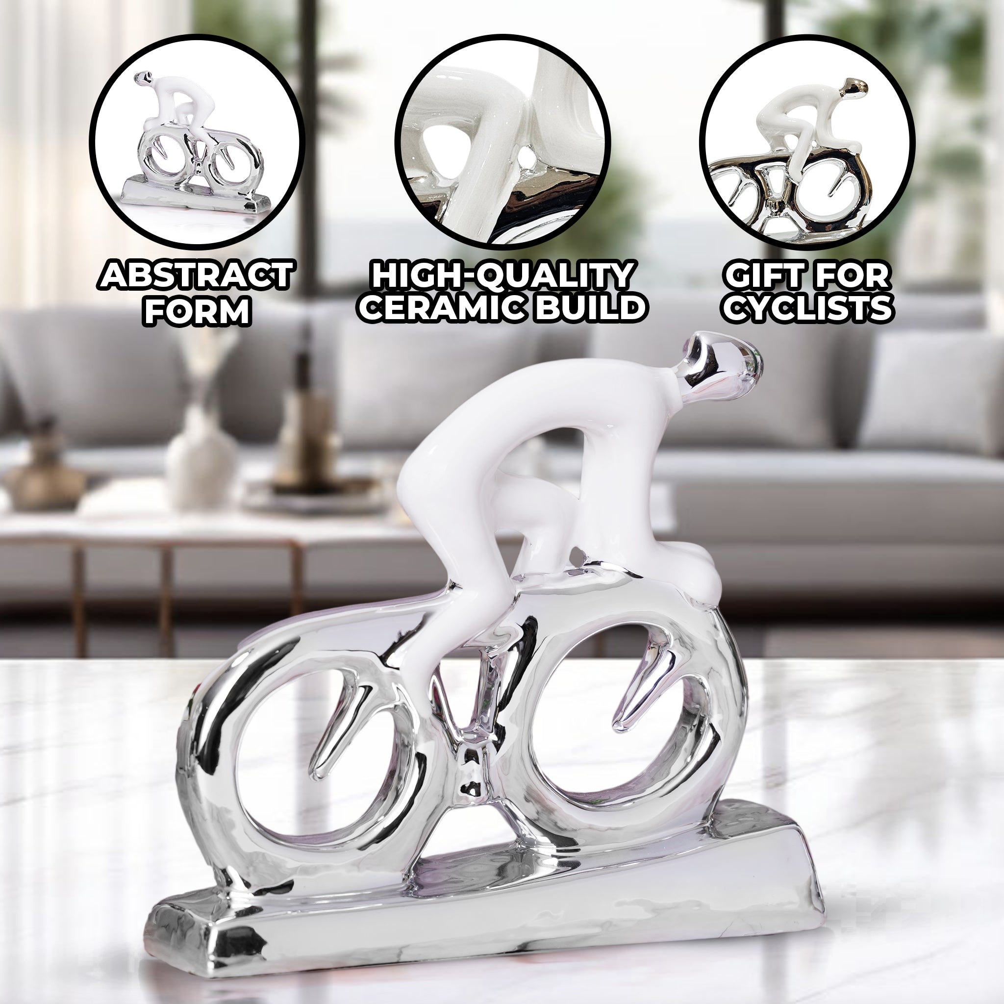 • SMALL DECORATIVE STATUE: 9 inch abstract cyclist statue, a perfect blend of artistry and elegance in white and silver for any table or furniture.