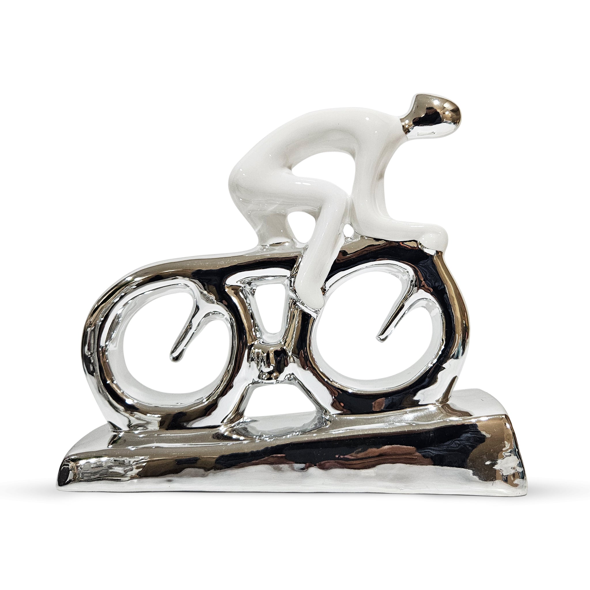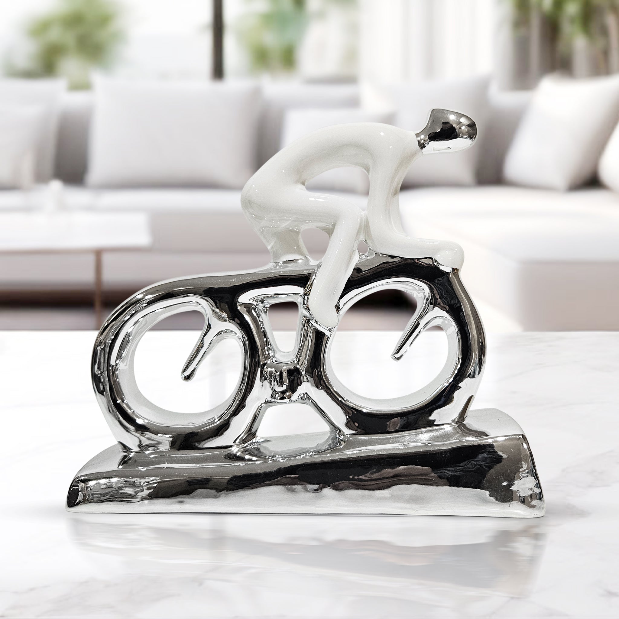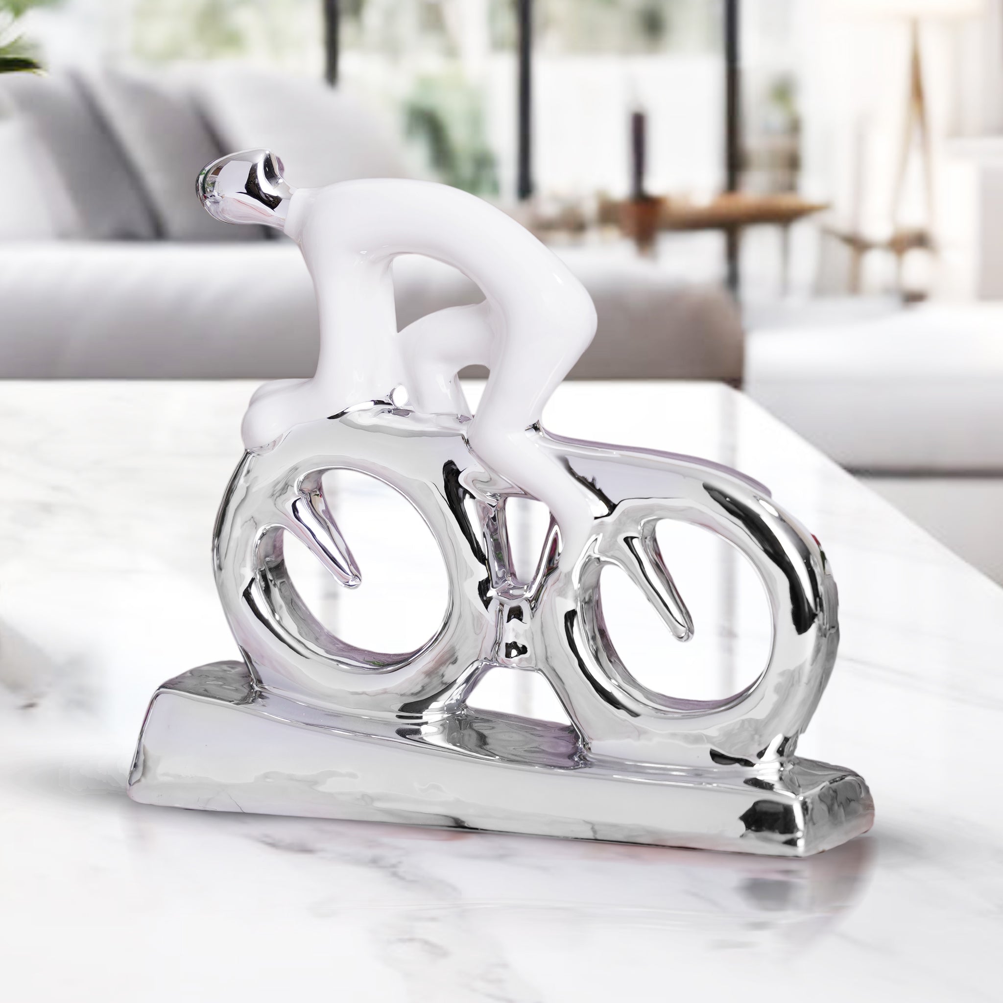 Accentuate your home with our Abstract Cyclist Statue, crafted from premium ceramics. This elegant white and silver bicycle sculpture adds sophistication to any space, whether as part of your living room figurine collection, entryway decor, or bookshelf aesthetic. Its modern design enhances contemporary and traditional settings alike, perfect for coffee tables, bedside tables, spa decor, and more. Versatile and stylish, it also complements TV consoles and bookcases, making a statement wherever it's placed. Transform your space with this unique ceramic decorative object today.
