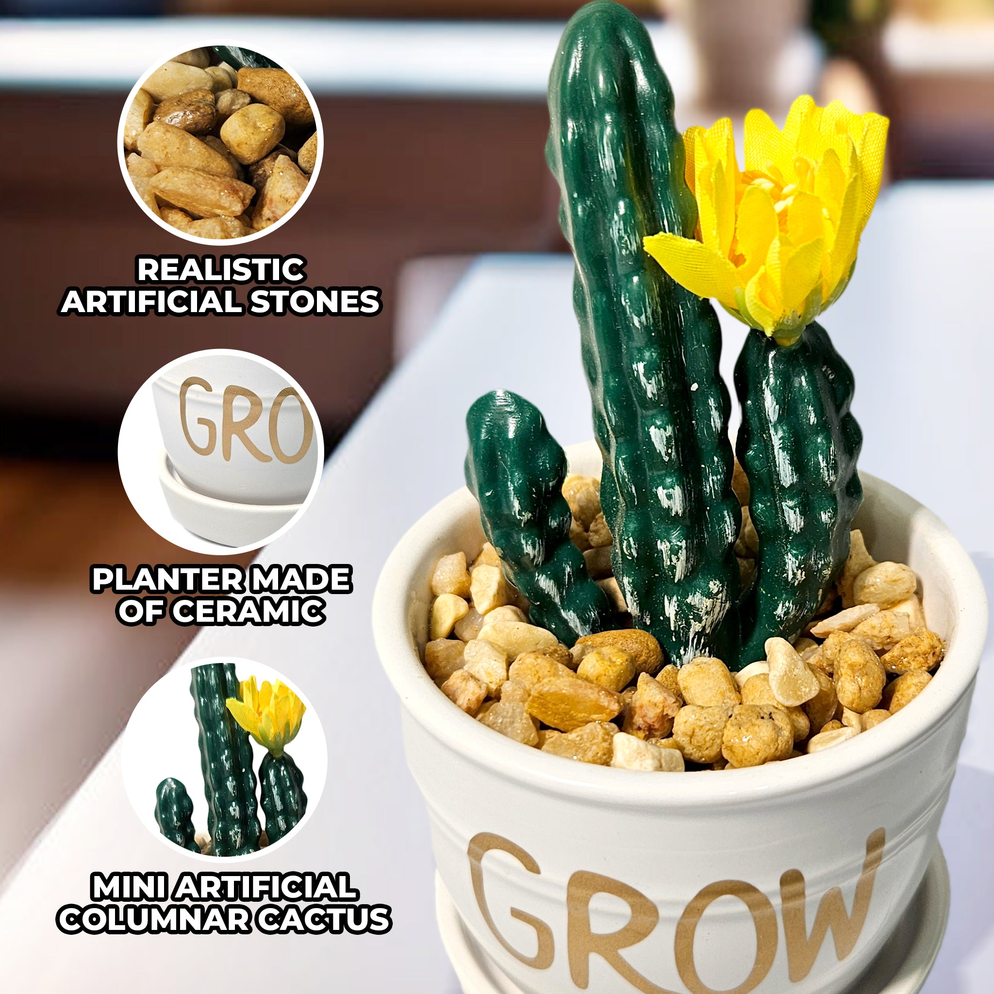 Bring a touch of nature indoors with this stylish potted columnar cactus tabletop decor. Featuring a lifelike mini artificial cactus with a vibrant yellow bloom, this decorative accent comes in a sleek white planter with the motivational word "GROW" printed in gold. The neutral design of this fake potted plant complements any interior, modern or classic, whether placed on a desk, shelf, or windowsill, and requires no maintenance, making it perfect for adding greenery to your space without the hassle.