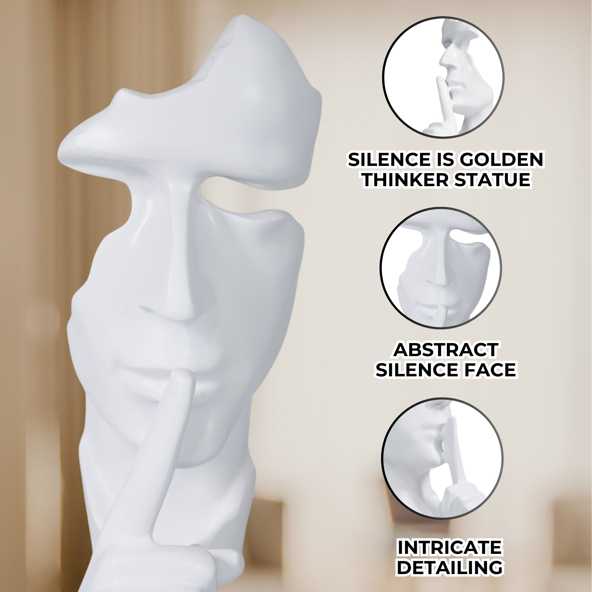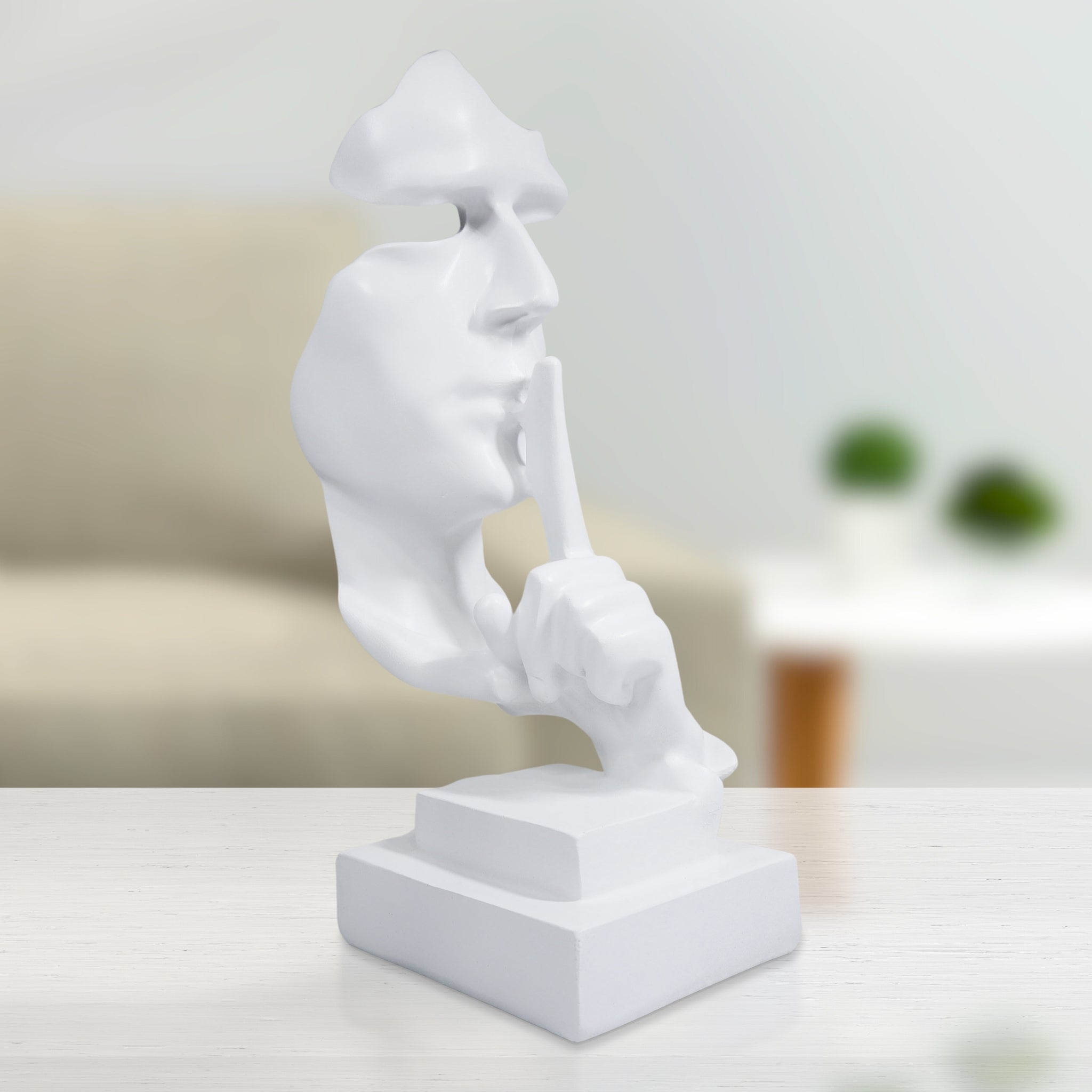 White Abstract Silence is Golden Silence Face Thinker Statue, Polyresin Artwork for Home or Office 12 inch 31 cm