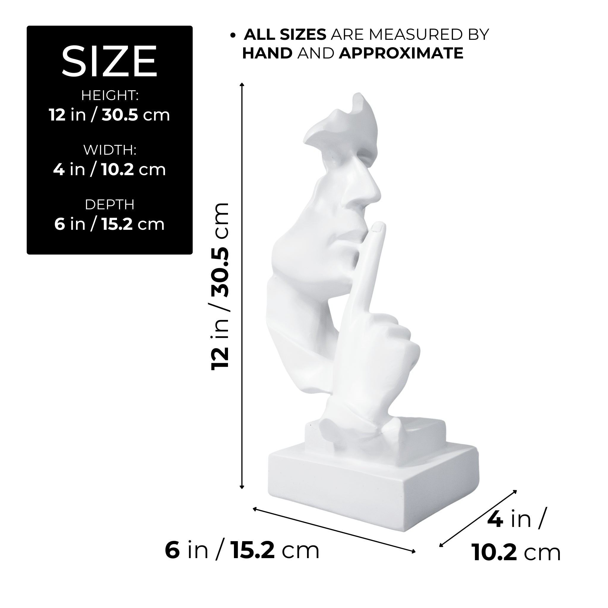 As this Silence Face Statue graces your home or office, everyone falls quiet. This elegant white sculpture, standing 12 inches (31 cm) tall, adds style to your living room, bedroom, office, study room, or library. Made from durable polyresin, the silence is golden sculpture is sturdy and well-crafted. The face structure is molded artistically with a clean minimalist white finish. The base of this thinker statue keeps it stable and protects your furniture from scratches. Guaranteeing versatility, this contemporary abstract art decor can be your most visually interesting coffee table decor item, entryway table decor, bookshelf decor, or mantle decor. With its neutral color, the abstract sculpture matches many styles, like contemporary, minimalist, or rustic. On top of it all, the abstract decor for living room is a great home decor gift for housewarming; and it comes in an easy-to-wrap box.