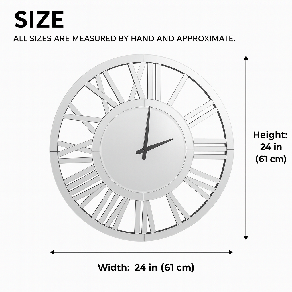Add a touch of sophistication to your interiors with this luxury 60 cm mirrored wall clock, designed to blend function with timeless elegance. Its vintage Roman numerals, slim metal hands, and silent sweep movement ensure easy readability and a tranquil, tick-free environment. Crafted from premium mirrored glass, this decorative wall clock is built for durability and long-lasting beauty. Whether displayed in a living room, bedroom, or office, its versatile design is ideal for any interior styling - from classic to modern contemporary An ideal choice for a housewarming, wedding, or anniversary gift, this elegant wall clock symbolizes refined taste and comes with professional after-sales support for a seamless shopping experience.