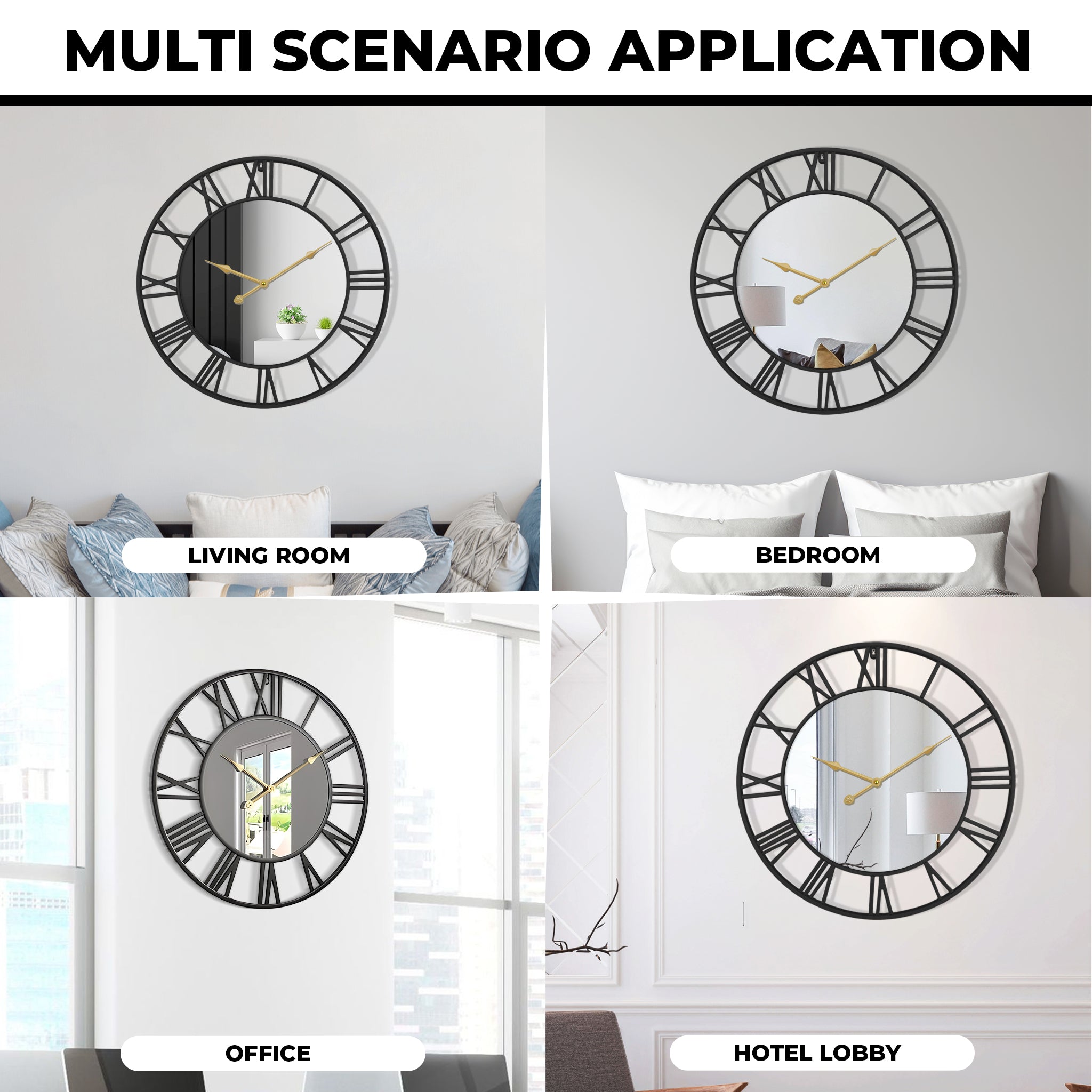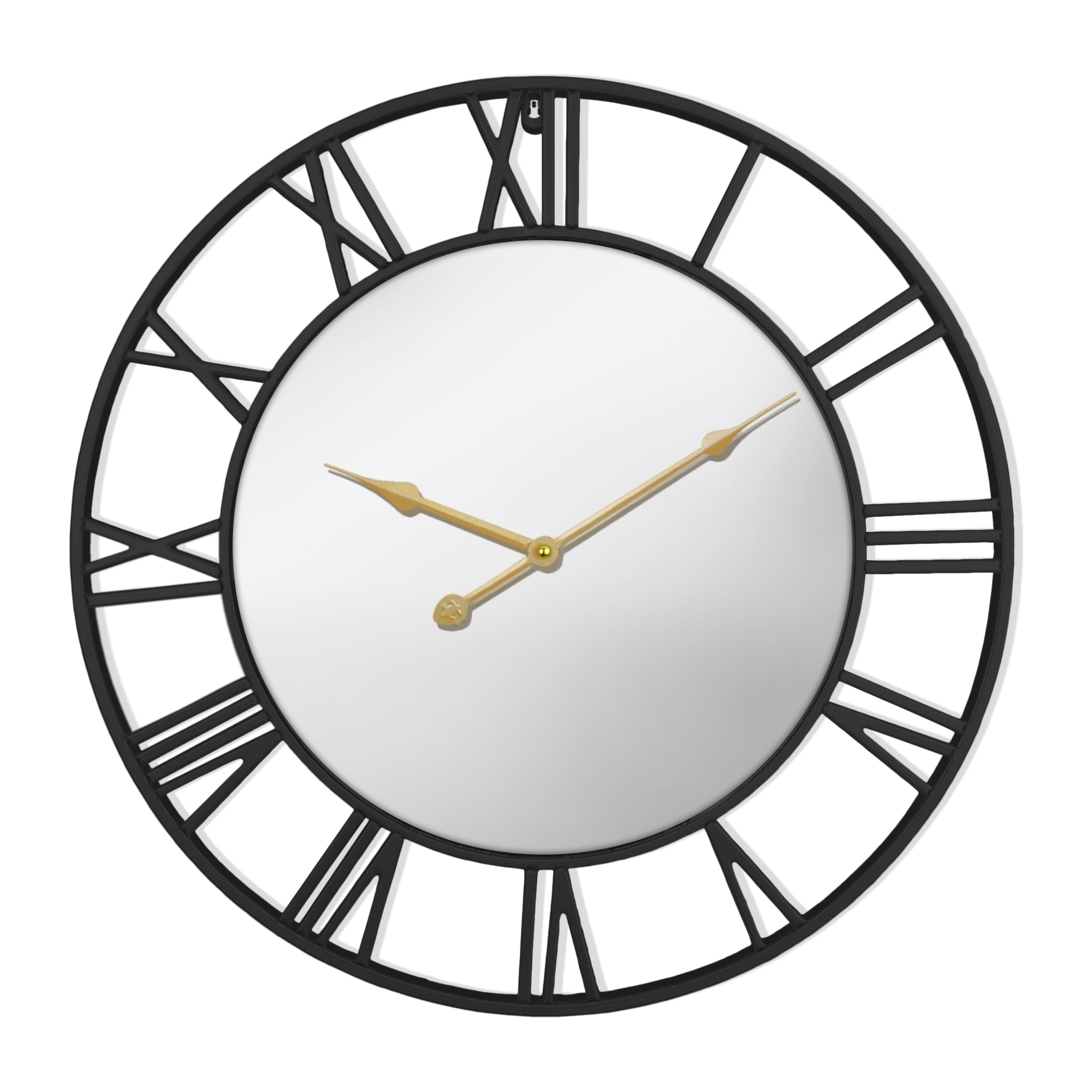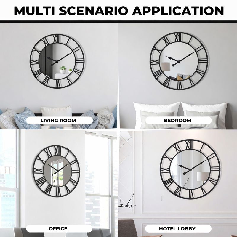 Large Black Wall Clock with Mirror, 24" Silent Roman Clock, Heavy Metal, Living Room Wall Decor