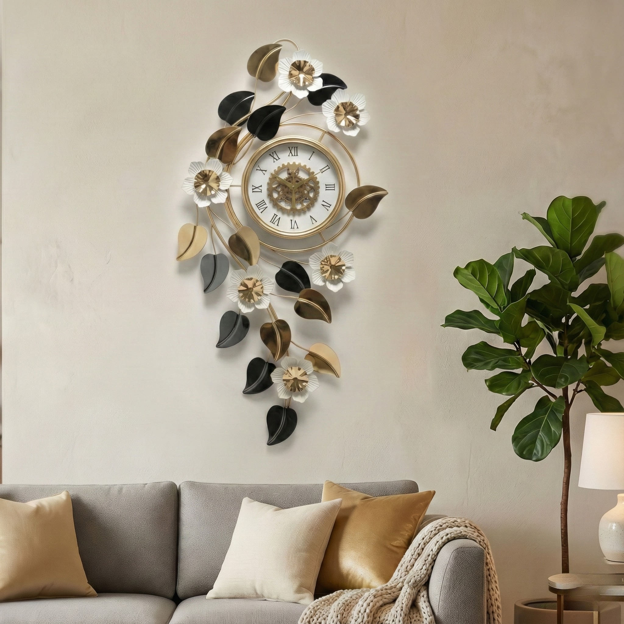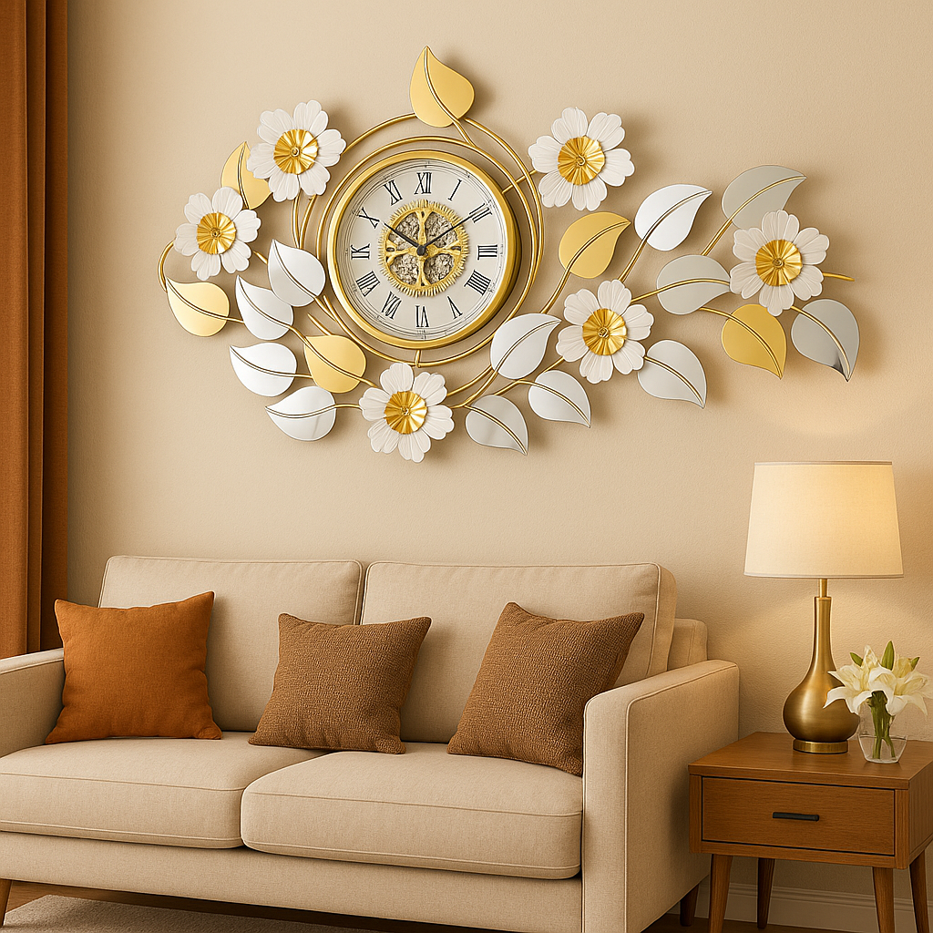 Beautify your living space with this Large Elegant Wall Clock featuring a sophisticated blend of gold, white, and silver tones in a delicate floral pattern. Crafted for both style and function, this clock is perfect for any interior design. Its striking design makes it a perfect statement piece for modern, contemporary, or classic interiors. Ideal for living rooms, bedrooms, offices, or hallways, this decorative wall clock combines luxury aesthetics with reliable timekeeping.