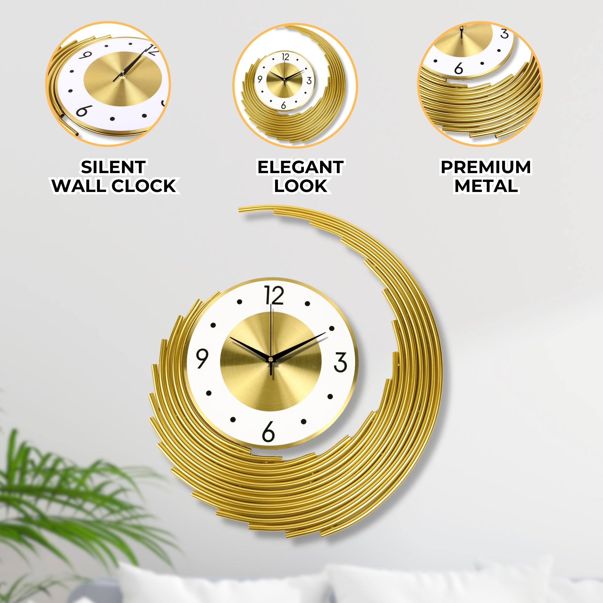 Elevate your living space with this stunning Large Gold Wall Clock. Featuring a unique swirl design in a luxurious gold finish, this analog wall clock not only tells time with precision but also serves as a captivating wall accent. Crafted from durable metal, this silent clock is perfect for any room, seamlessly blending with various interior styles. Its large, easy-to-read dial and simple installation make it a practical and stylish addition to your home or office decor. An elegant decor above the bed, over the couch, or over the fireplace, this golden wall clock easily captivates anyone who beholds it.