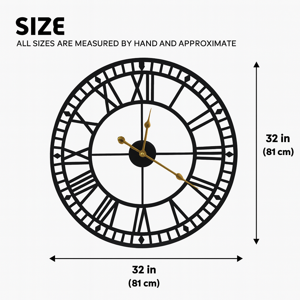 Enhance your home with the timeless elegance of the Oversized Round Metal Wall Clock. Measuring an impressive 32 inches, this statement piece features a sleek black metal frame with bold Roman numerals, adding a touch of vintage charm and modern sophistication to any room. Designed with silent, non-ticking quartz movement, it ensures a peaceful atmosphere while keeping accurate time. Perfect for living rooms, kitchens, offices, or entryways, this clock blends seamlessly with industrial, farmhouse, and contemporary decor styles.