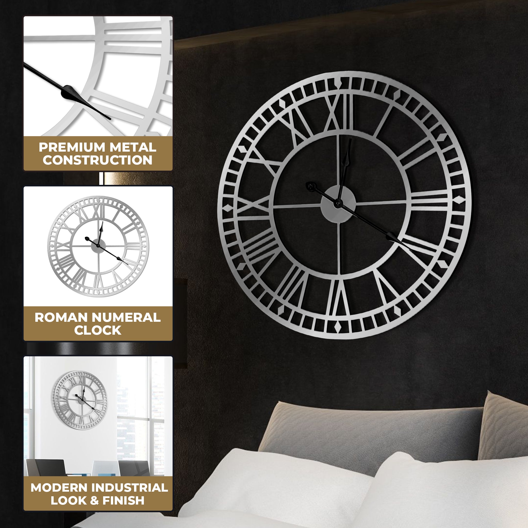 Oversized Round Metal Wall Clock, Large 32", Roman Numeral Silver Silent Clock Home Office Decor