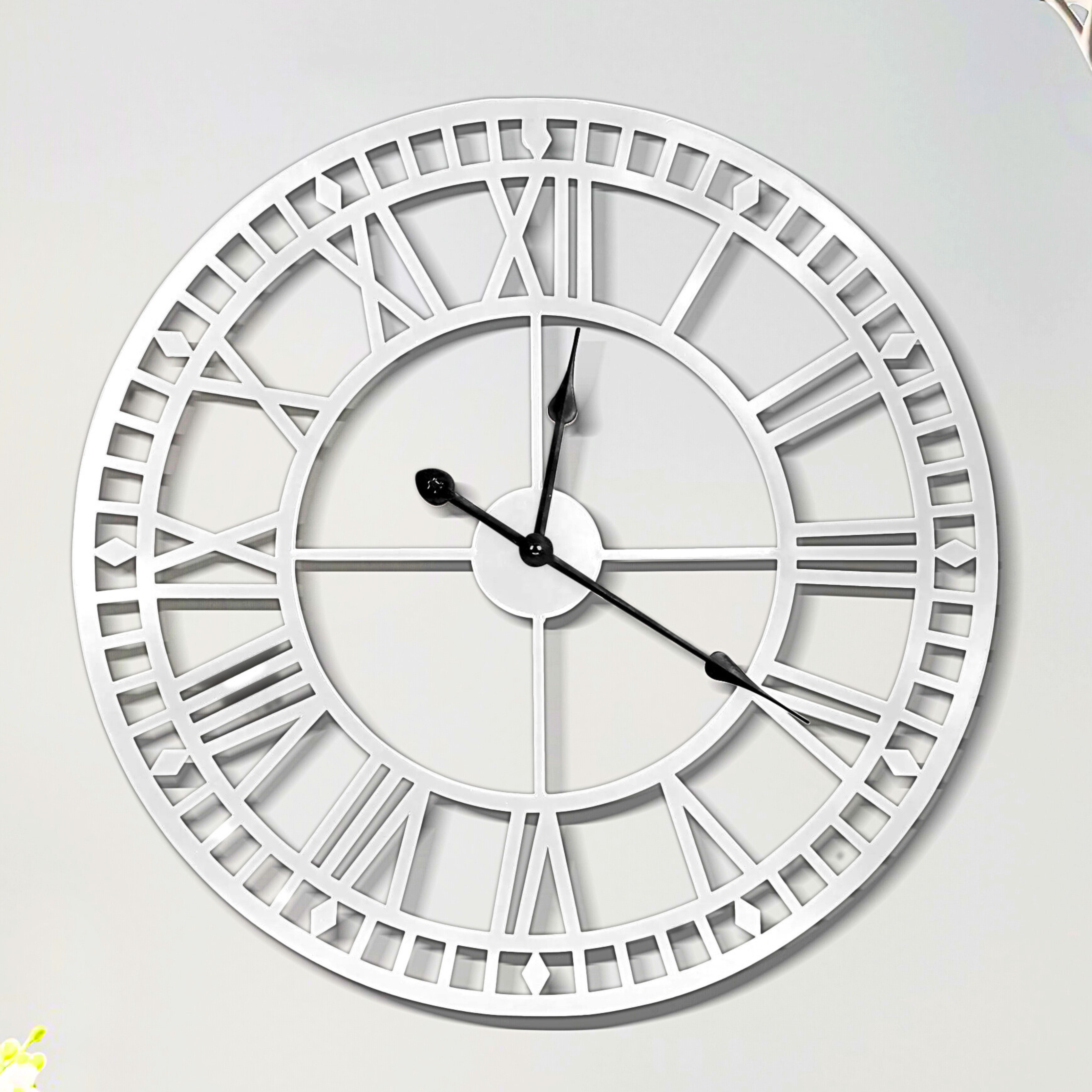 Enhance your home with the timeless elegance of the Oversized Round Metal Wall Clock. Measuring an impressive 32 inches, this statement piece features a sleek silver metal frame with bold Roman numerals, adding a touch of vintage charm and modern sophistication to any room. Designed with silent, non-ticking quartz movement, it ensures a peaceful atmosphere while keeping accurate time. Perfect for living rooms, kitchens, offices, or entryways, this clock blends seamlessly with industrial, farmhouse, and contemporary decor styles.