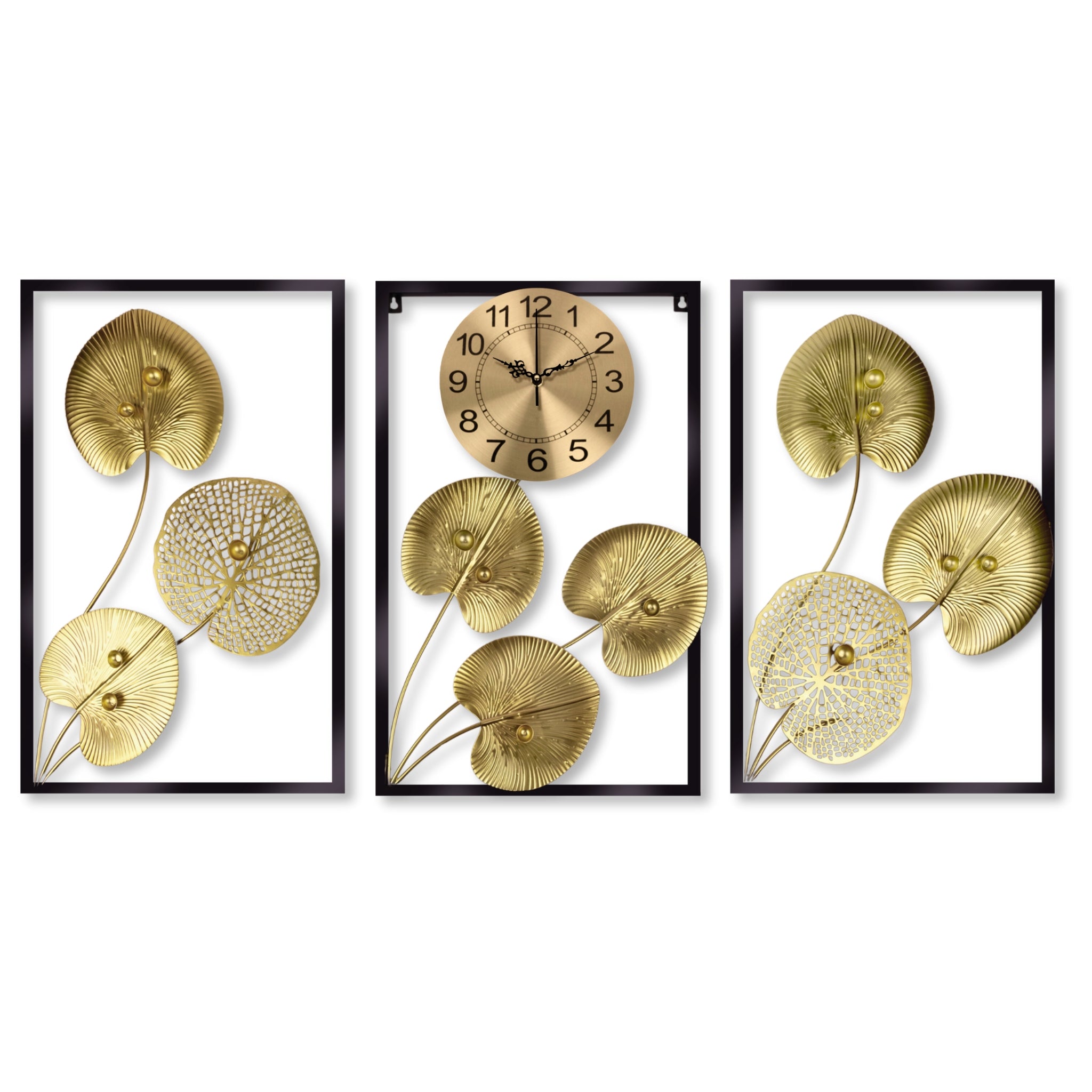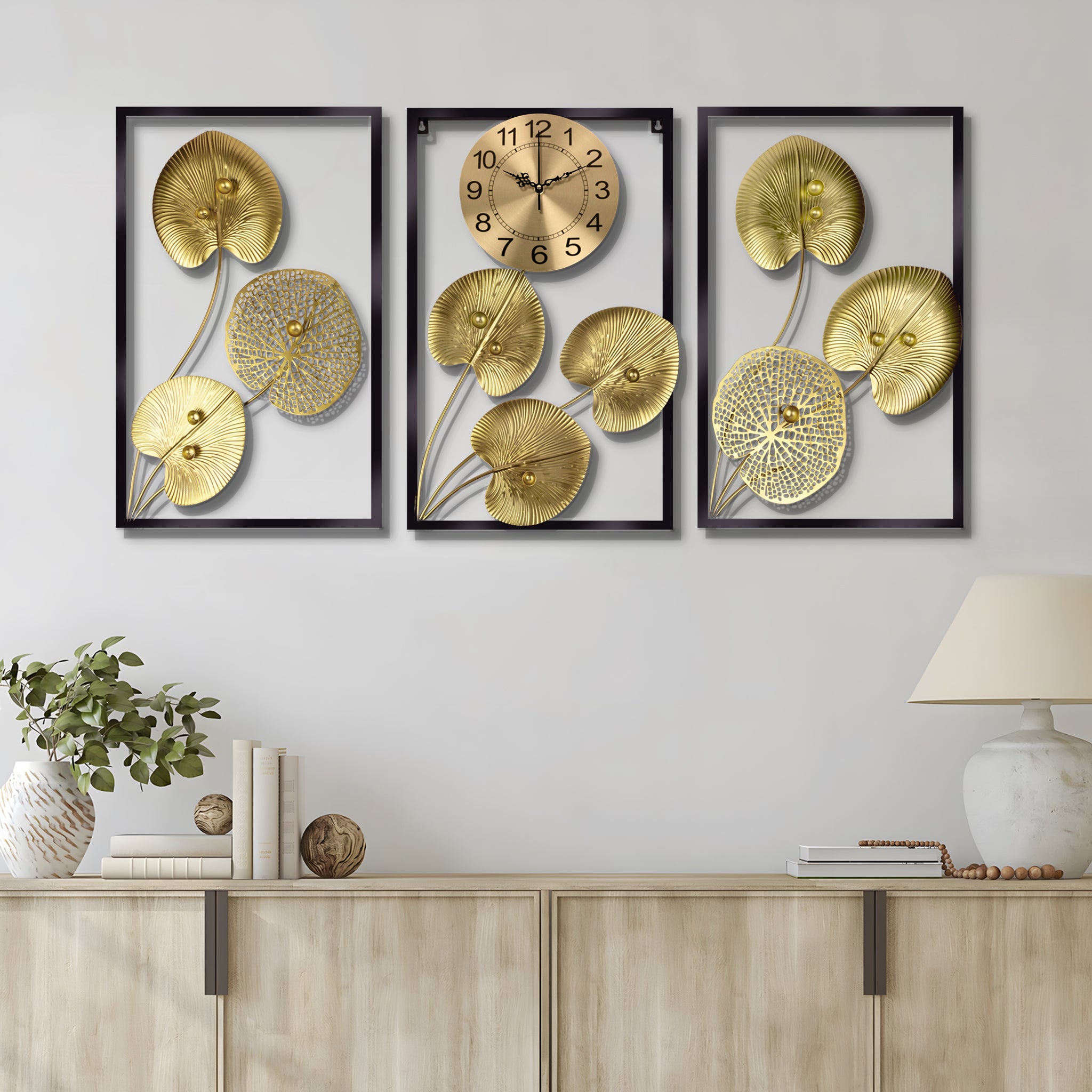 Ever feel like your living room walls are a little lifeless? We all want a space that reflects our personality and makes us feel good when we walk in. But sometimes, getting that perfect balance of style and function can be tough. Thanks to this set of three Wall Art Decor that showcases botanical wall art pieces with a golden round clock, your walls will definitely come to life. It's a large analog wall clock made of metal - durability and timeless elegance guaranteed. Imagine the warm glow of this wall clock in golden leaf design as it reflects light - a treat to the senses. The round wall clock is non ticking, so it is unable to disrupt your activities in the living room, bedroom, or office. Easy to install, this metal wall clock is super easy to hang on the wall. Ensure to insert the 1AA battery into the socket before mounting (battery NOT included).