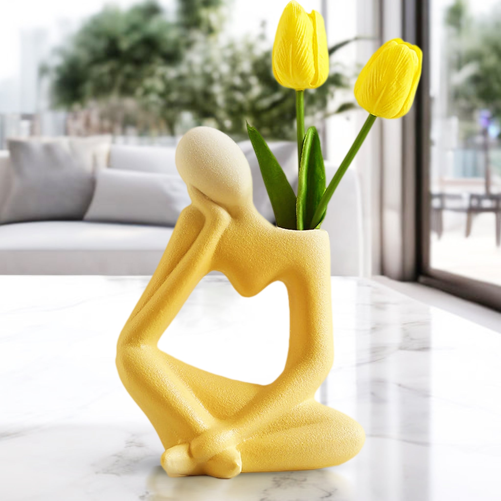 Brighten your space with this exquisite yellow bud vase, a perfect blend of ceramic and abstract art. Functioning as a vase and as a decorative figurine, it adds vibrant elegance to any entry table, coffee table, or office desk. Its sunny hue and boho charm make it a chic centerpiece or thoughtful gift for mom on Mother's Day, for wife on your Anniversary, or your girlfriend on Valentine's Day. Ideal for minimalistic and boho table decor, this unique piece offers a refreshing take on desk aesthetics.