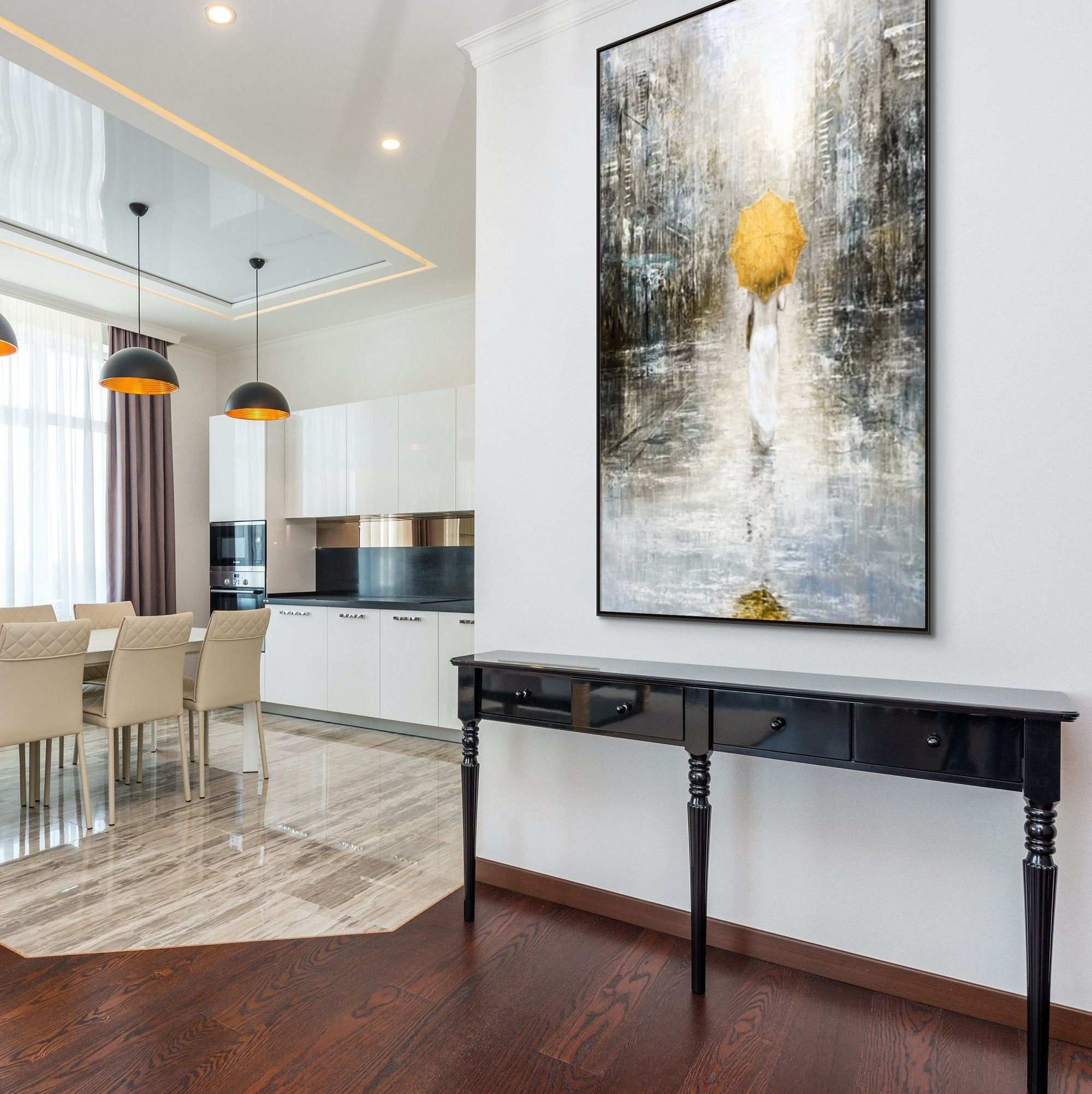 Lost in the City, Large Painting of Girl in Rain, Abstract Painting, Original Art, Oil Painting for Living Room, Oversized Wall Art, Yellow