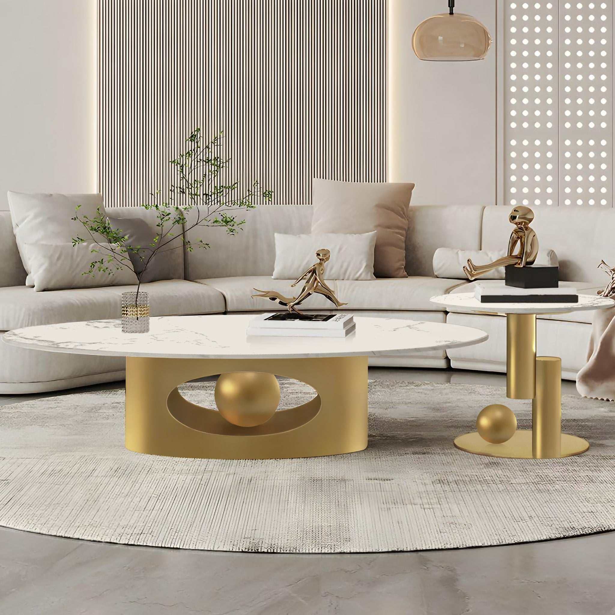 Modern Golden Oval Coffee Table Set 47" and 20", White Marble Surface, Metal Ball Base Design Home Decor