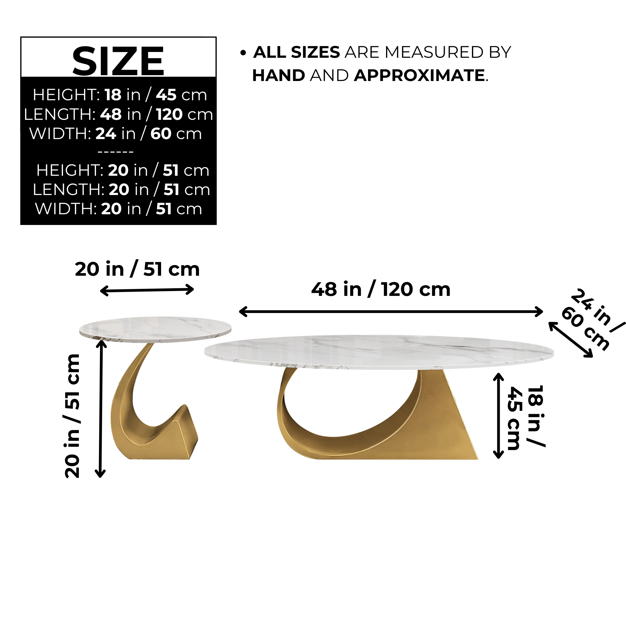 Modern Oval Coffee Table Set 47" and 20" White Marble Top, Metal Gold Frame