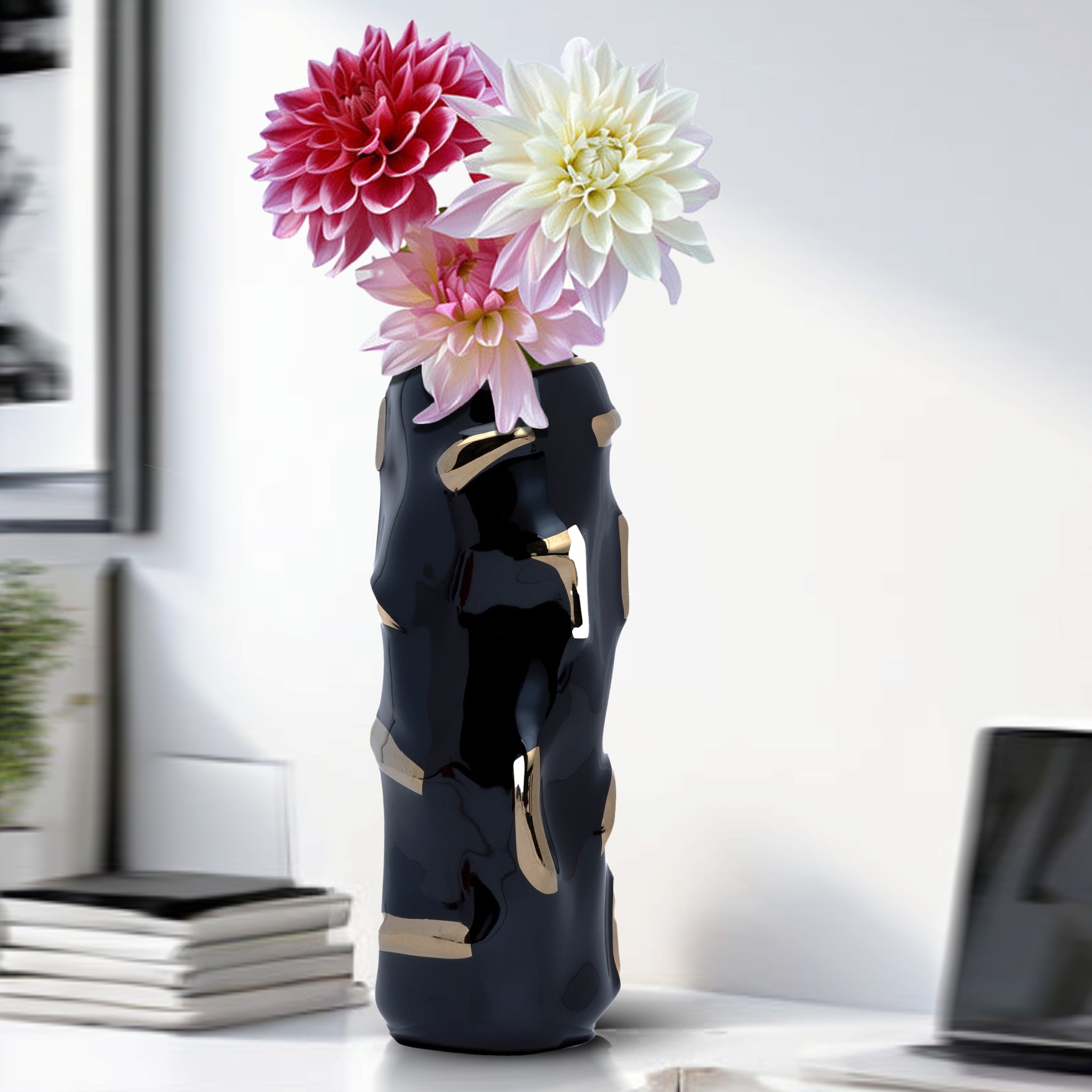 Abstract Black Ceramic Vase, Golden Highlights, 12" Table Decor