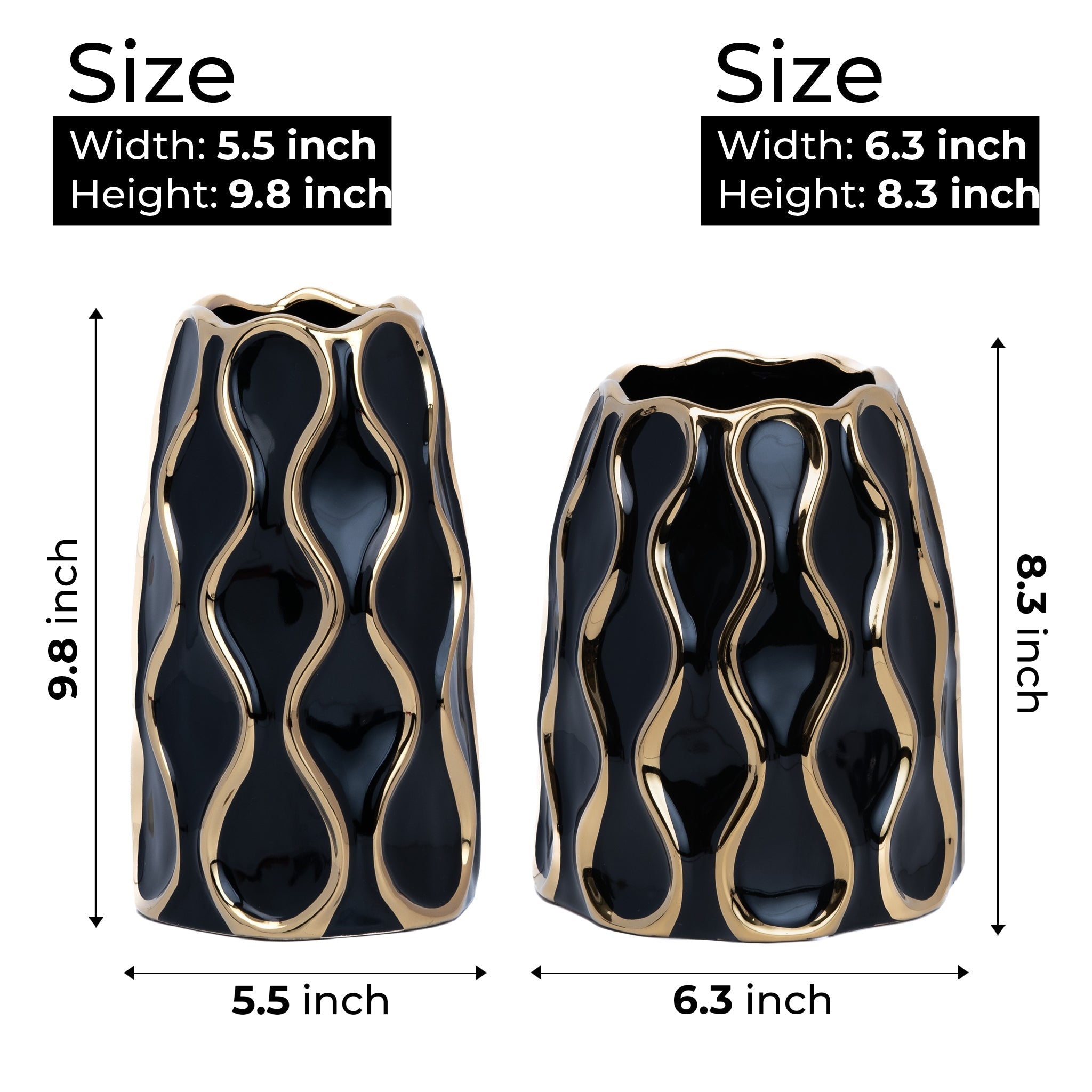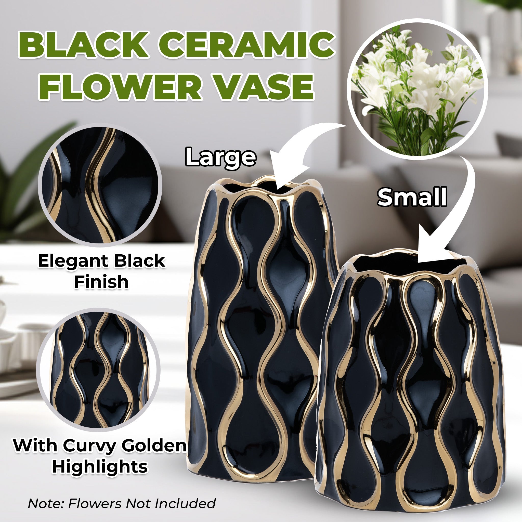 • Black Ceramic Vase with Golden Trim is available in medium size at 10 inch and small size at 8 inch - or buy as a pair (Medium and Small) for an elegant coordinated look.