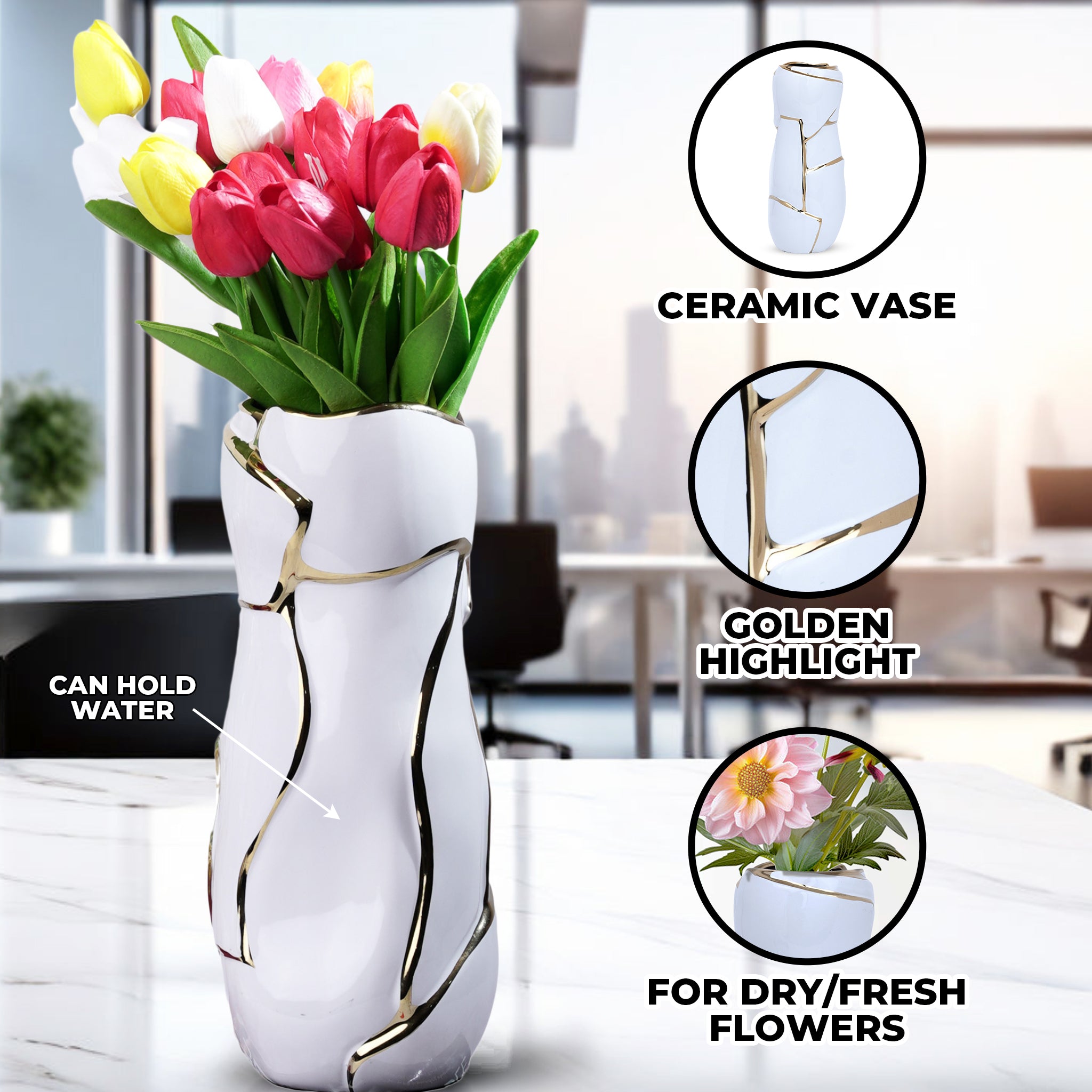 Abstract White Ceramic Golden Lines Vase - Elegant Table Centerpiece For Fresh & Faux Flowers