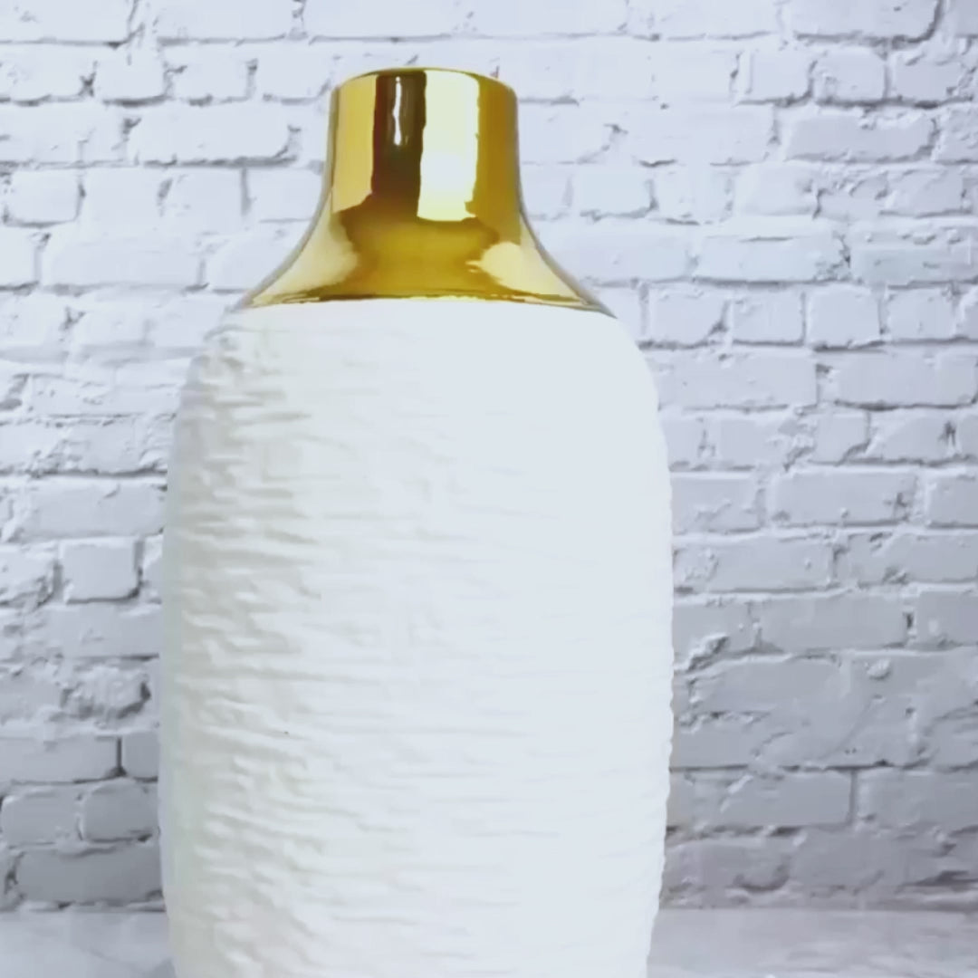 • 12 inch White Ceramic Vase with golden rims for an elegant minimalist touch in your living room decor.