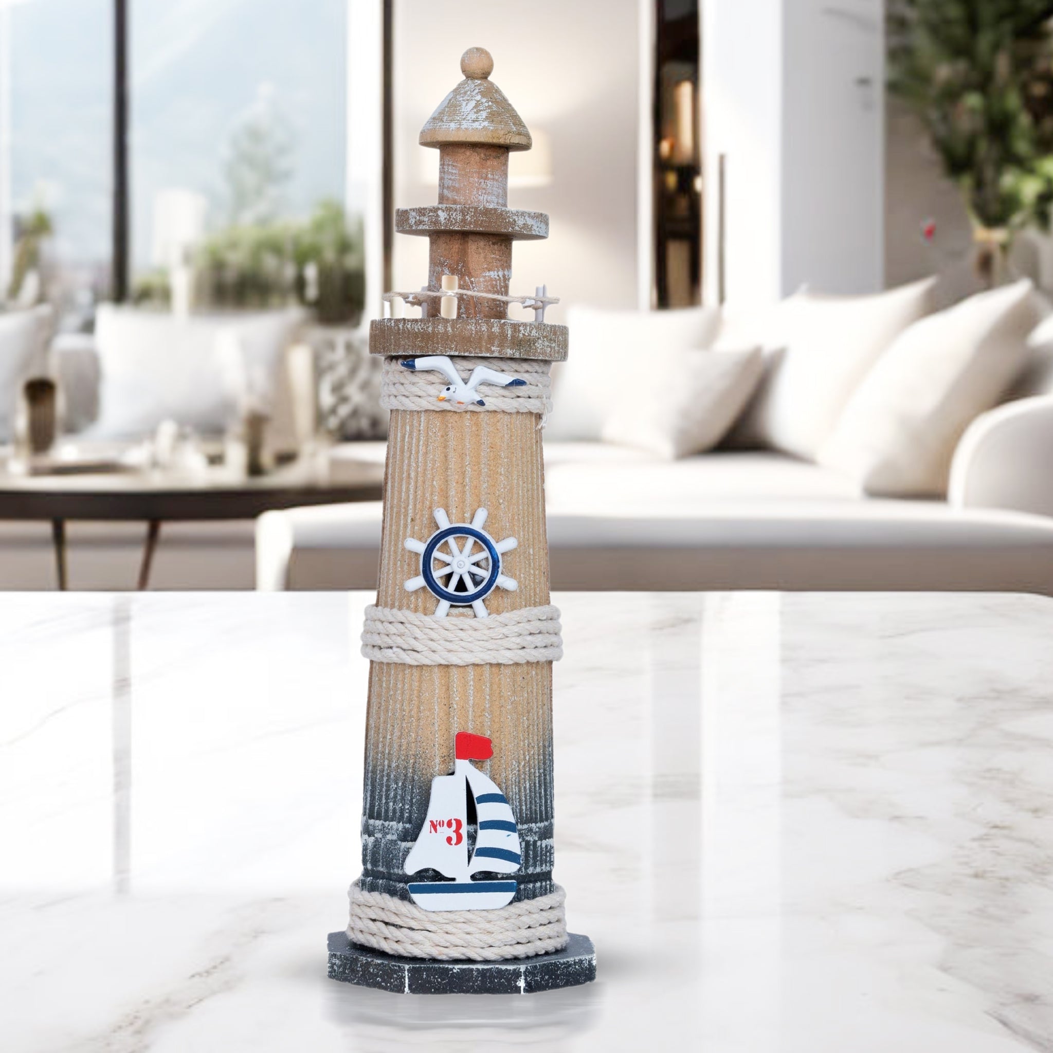 Embrace coastal serenity with our handcrafted Wood Brown Miniature Lighthouse. This rustic nautical decor adds a vintage charm to any space, making it an ideal housewarming gift. Perfect for elevating coastal table decor, enhancing a bookshelf, or adding a nautical touch to your bathroom. Bring the calm of the coast into your home with this versatile wooden sculpture, a charming centerpiece for your living room, office, or commercial space. It's the perfect reminder of the calmness of the sea for a more relaxing and serene indoor space.