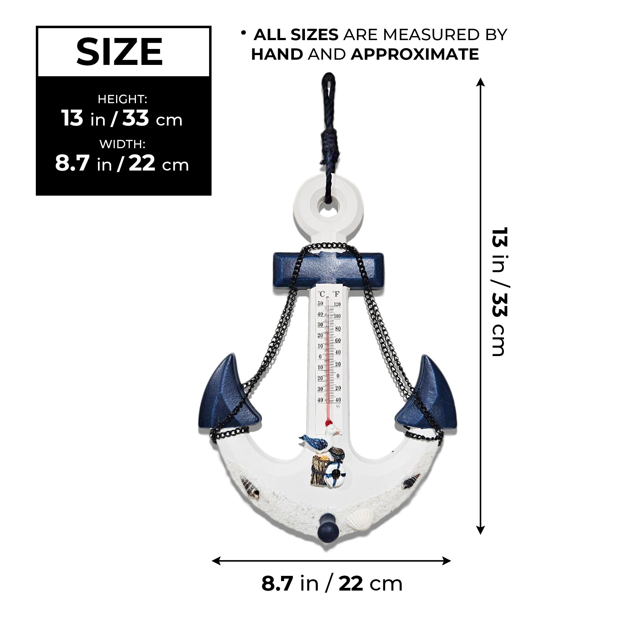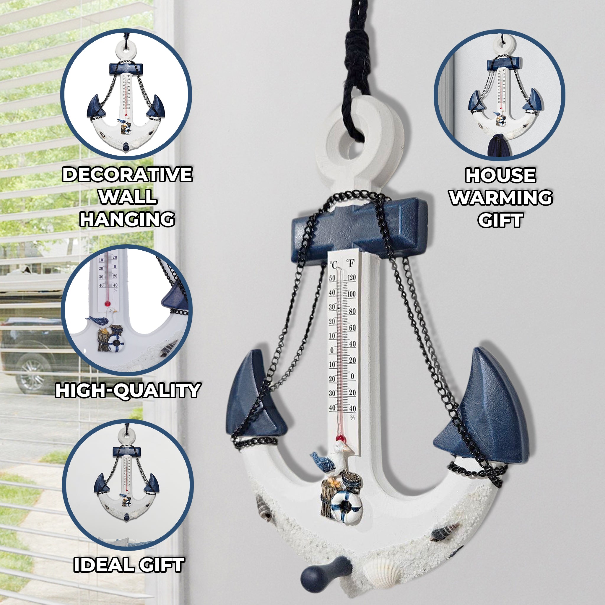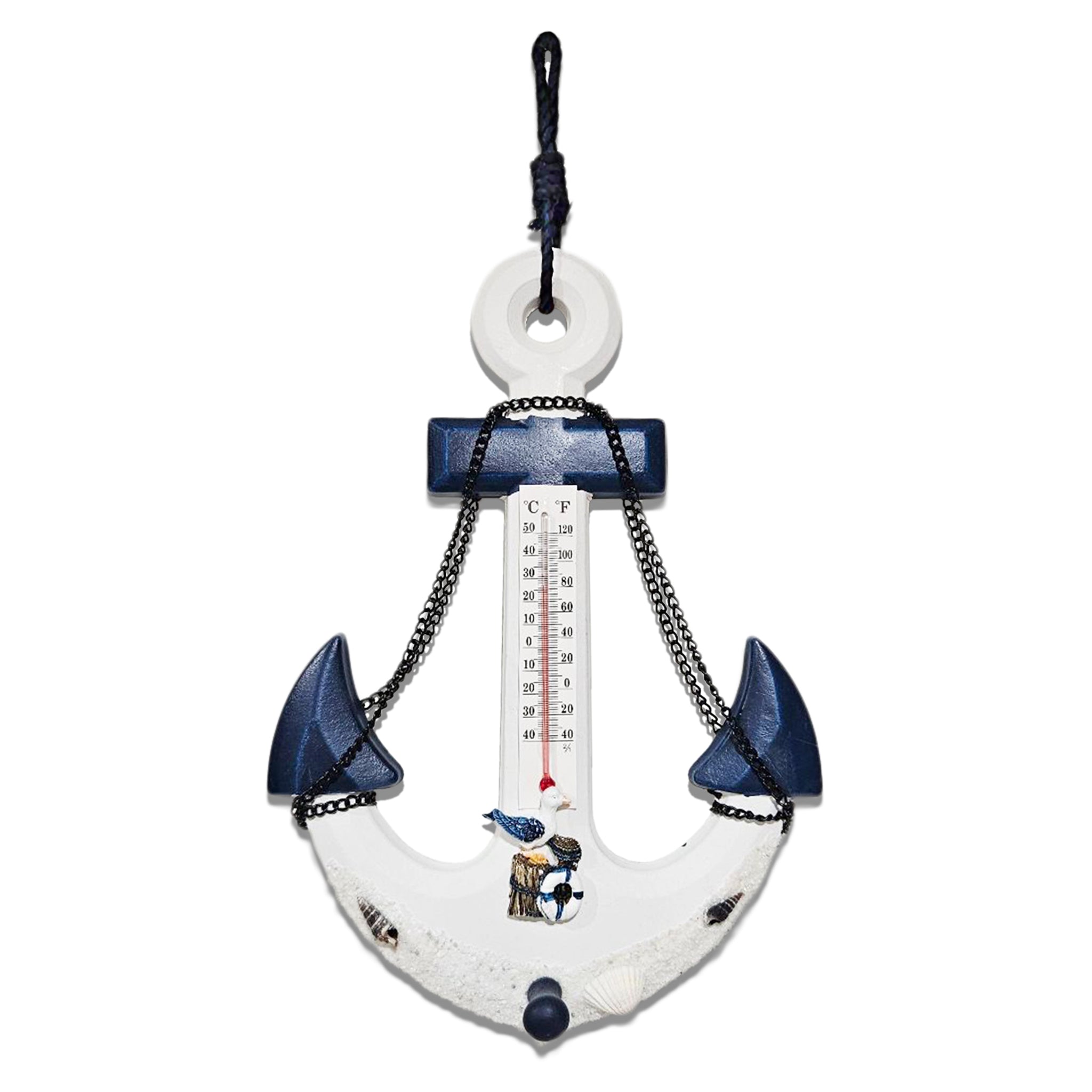 Bring coastal charm to your home with our Nautical Anchor Coat Rack, featuring a built-in temperature gauge. This decorative wall-mounted rack is both functional and stylish, perfect for hanging coats, hats, and purses while adding a touch of maritime flair to your space. Ideal for sailor or beach-themed decor, it combines rustic charm with practicality. The handy thermometer lets you check the weather at a glance, making it a unique centerpiece for any room. Transform your entryway or bedroom with this rustic blue anchor wall art—your perfect nautical accent!