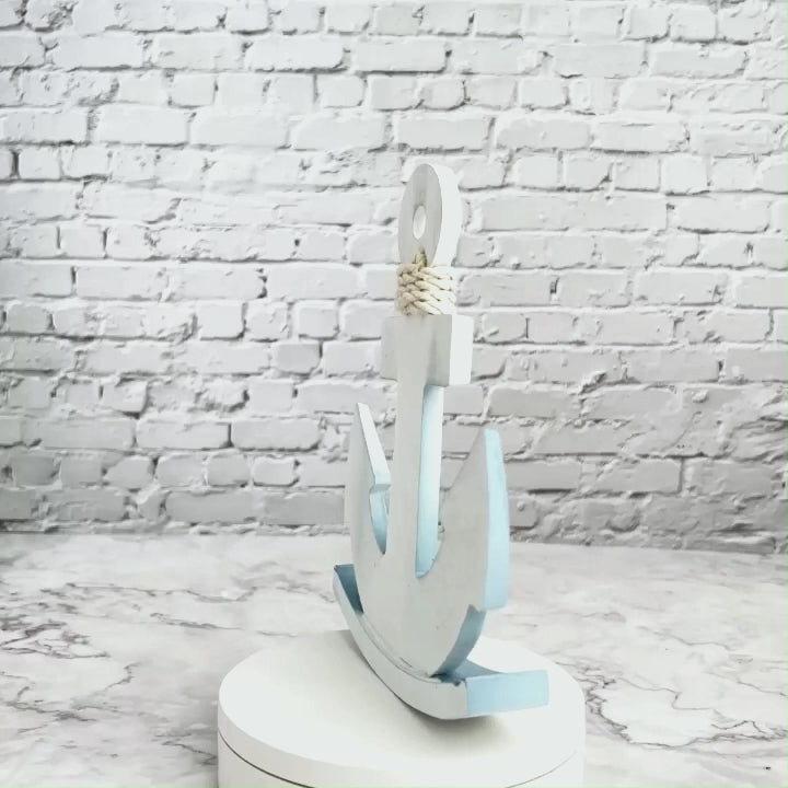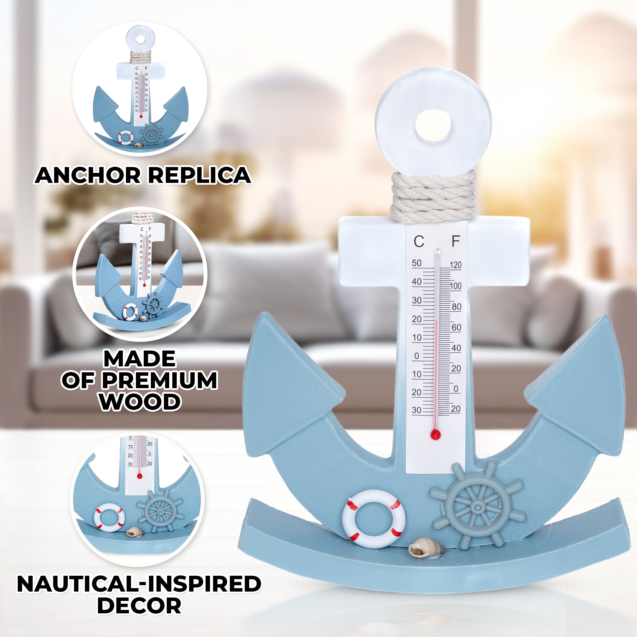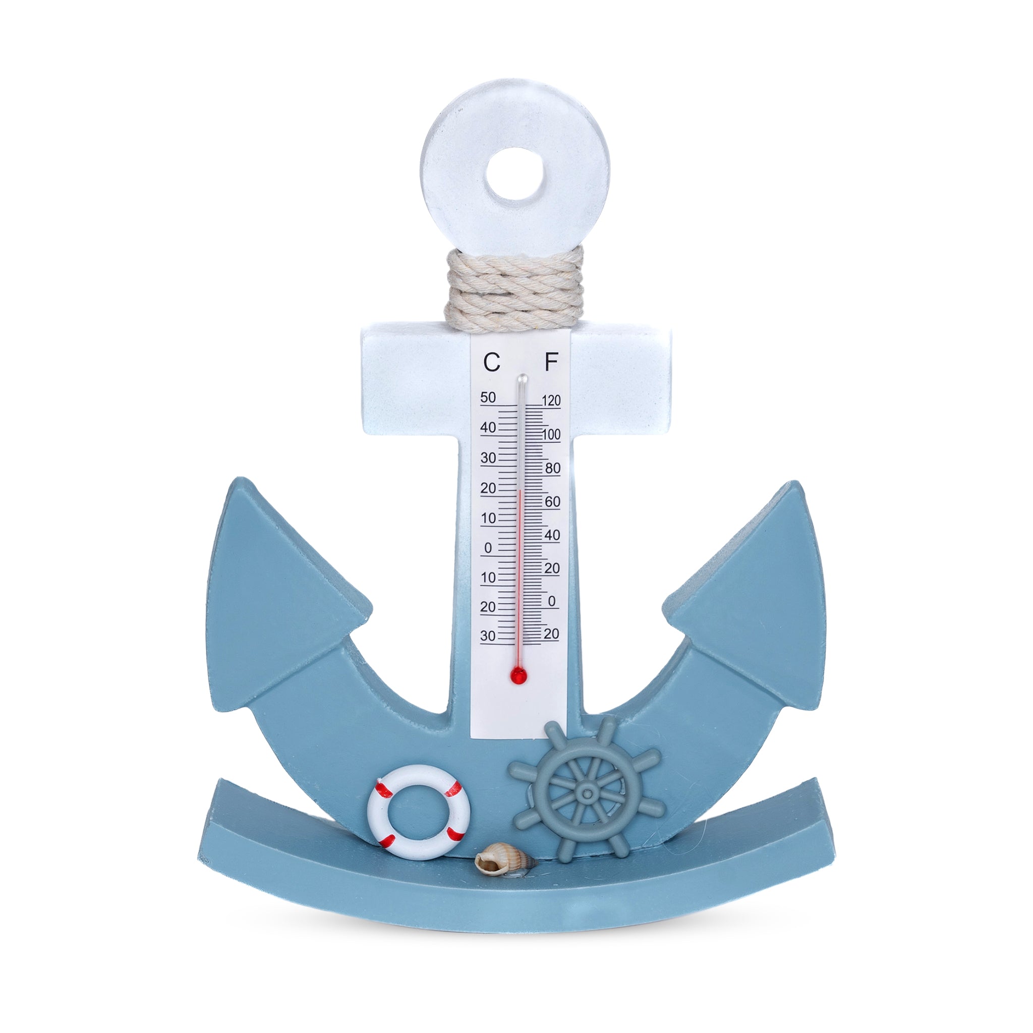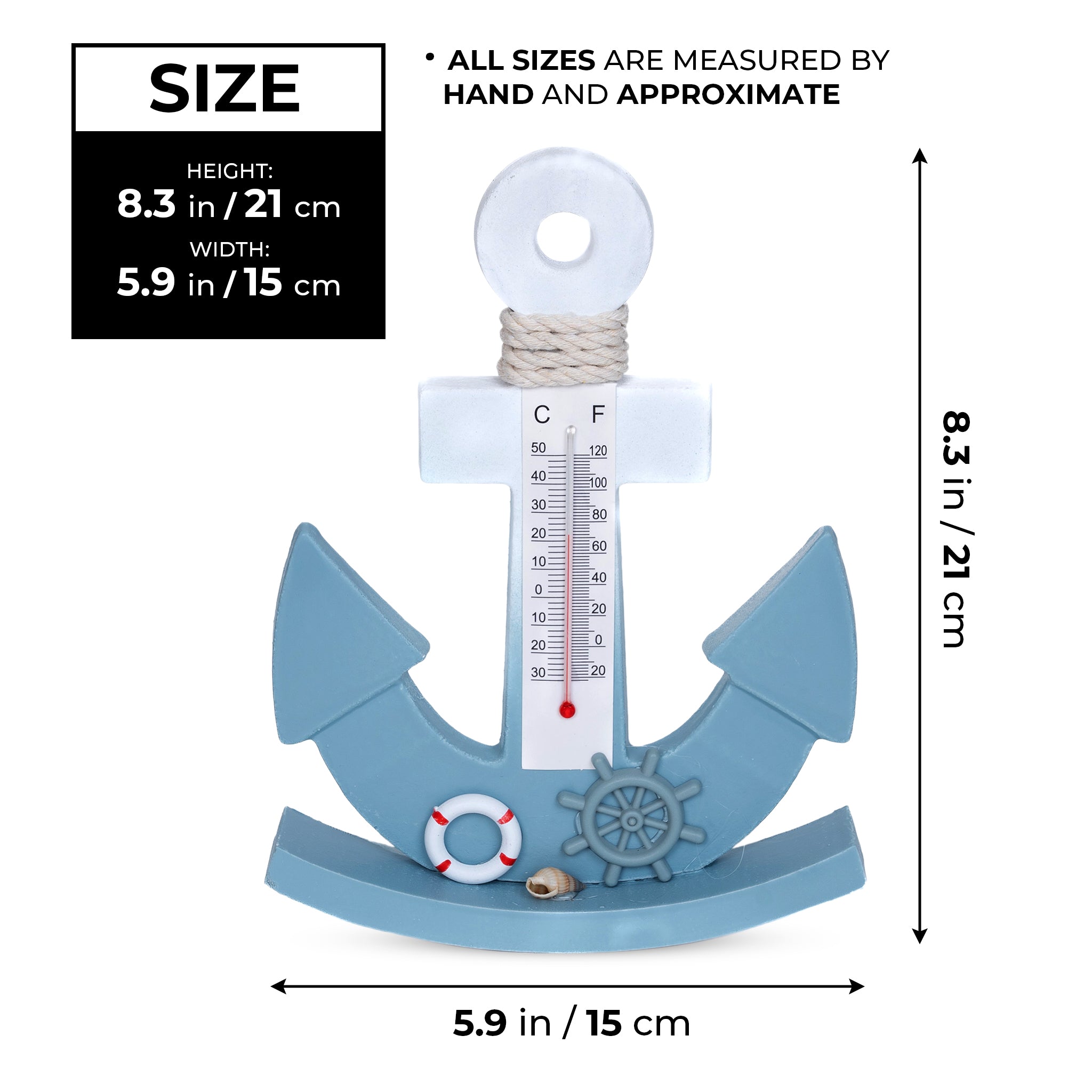 Bring a touch of the sea into your space with this unique wooden tabletop anchor with thermometer, a charming nautical decor piece perfect for any table, desktop, or console table. Featuring a soothing blue and white finish, this small yet striking marine-inspired figurine combines style and function—ideal for tracking the temperature while adding coastal flair. Whether used as a desk ornament, office gift, or decorative statue for your fireplace mantel, this anchor is a standout piece in any beach-themed room or ocean-inspired study. Its versatile size makes it perfect for bookshelf styling, tv stand decoration, or as a centerpiece on your tabletop. This home decor accent is more than just a thermometer ornament—it’s a heartfelt nod to the sea, perfect for enhancing your coastal cottage, nautical office, or ocean nursery. Whether you're decorating your living room, entryway, or gifting a ship-themed treasure, this decorative anchor sculpture brings the calm and wonder of the waves indoors.