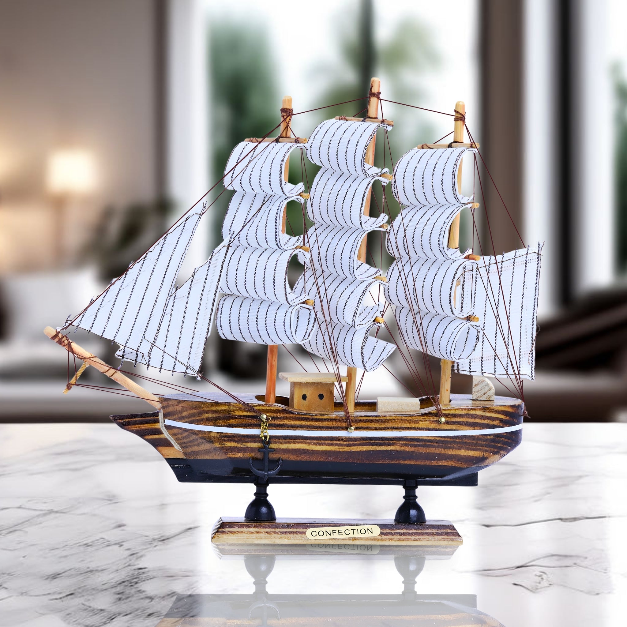 Brown Wooden Sailboat Model With Realistic Cloth Sails - Nautical Marine-Inspired Home Decor