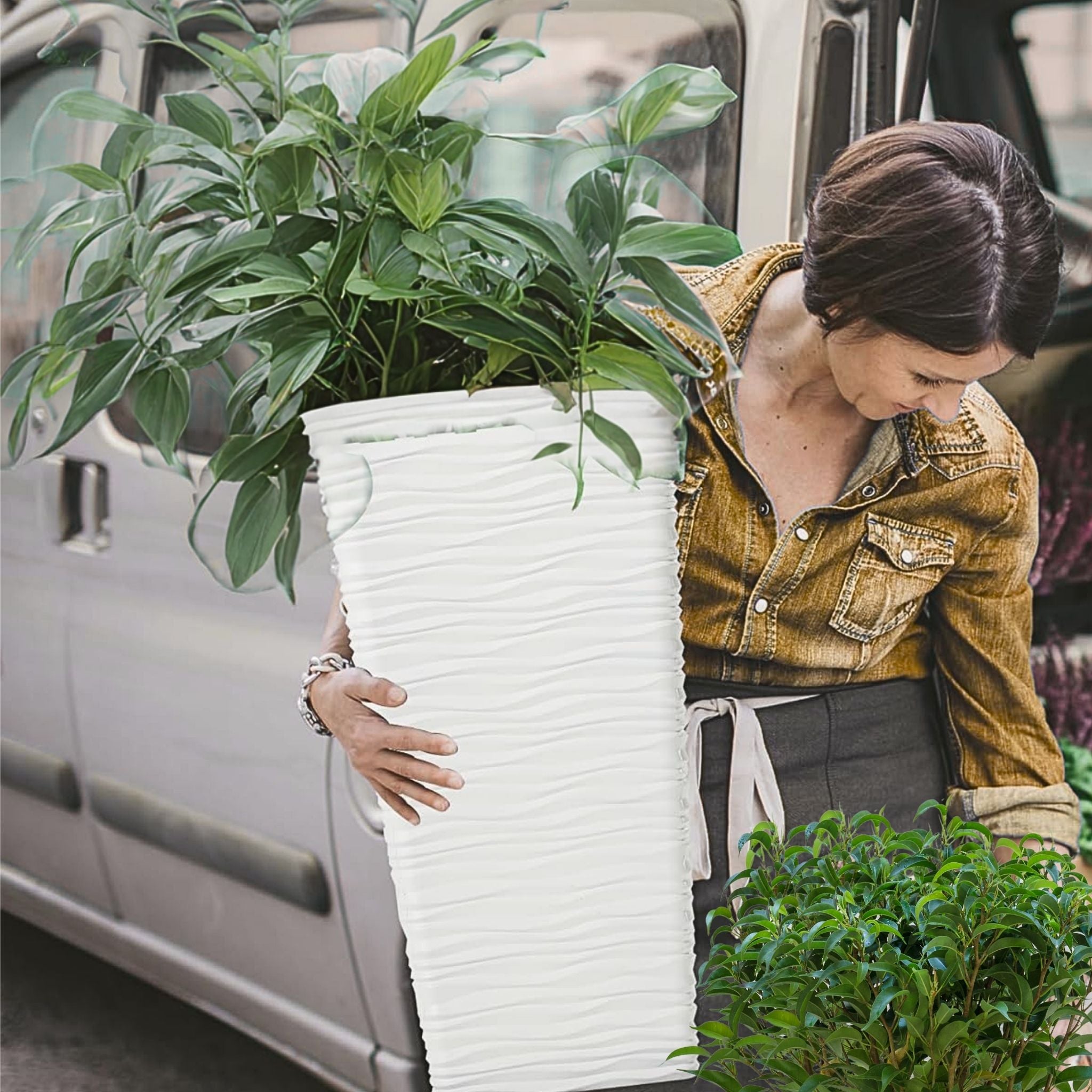 Bring a touch of modern minimalism to your space with this 22-inch Tall White Planter Pot set, designed for both indoor and outdoor use. Its sleek mid-century style and high-quality plastic construction make this pair of pots a perfect decorative accent for any home, office, patio, front porch, or garden. Whether placed at your entrance, in the backyard, or inside your living room, this versatile flower vase-style plant pot with glazed wave pattern complements all environments while showcasing your favorite real or faux plants. There is a marked space at the bottom of the pot where you can easily drill a hole to prevent overwatering and promote healthy plant growth.
