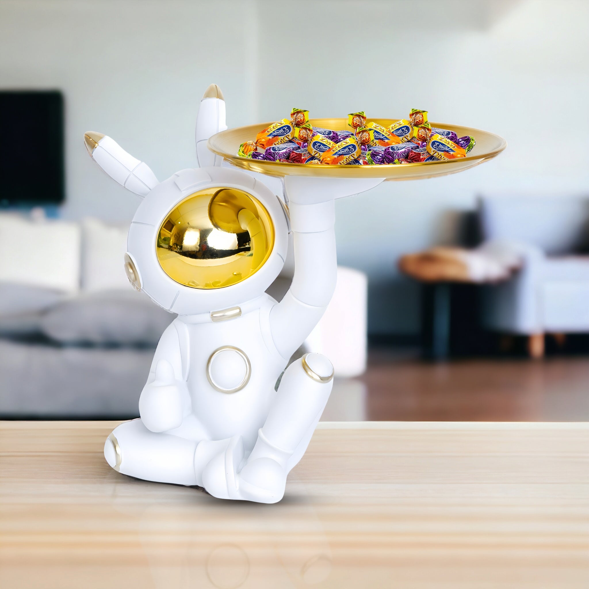 Transform your space with our whimsical white astronaut sculpture! This cute, funny polyresin piece is perfect as a keys holder or gold metal tray, making it an ideal addition to any kids' room or nursery decor. Versatile and charming, it serves as a candy dish, jewelry tray, or centerpiece. Whether used as a tray for the bathroom, office, or living room, it adds a playful touch to any space. From tiered tray decor to a cheerful candy dish, this unique sculpture brings smiles and style wherever it goes. Elevate your decor with this multifunctional decorative tray!