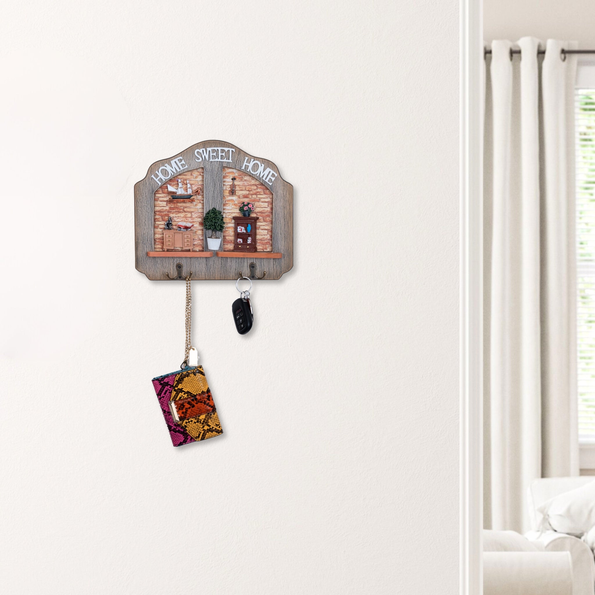Welcome to the charm of practicality with our Wooden Key Holder Rack! This isn't just any key hanger wall mount; it's a blend of coziness and utility, designed to adorn your entrance hallway or entryway. Engraved with "Home Sweet Home" and enriched with a whimsical furniture design, this decorative piece brings an air of warmth to your space. Featuring 2 double hooks, it's perfect for keeping your essentials organized—from keys to lightweight bags. No more frantic searches in the morning; instead, enjoy a seamless transition out the door. Ideal for your home organization needs and also functions as a farmhouse-inspired decor style that effortlessly complements your apartment decor aesthetic. Say hello to a tidier, more welcoming entryway!