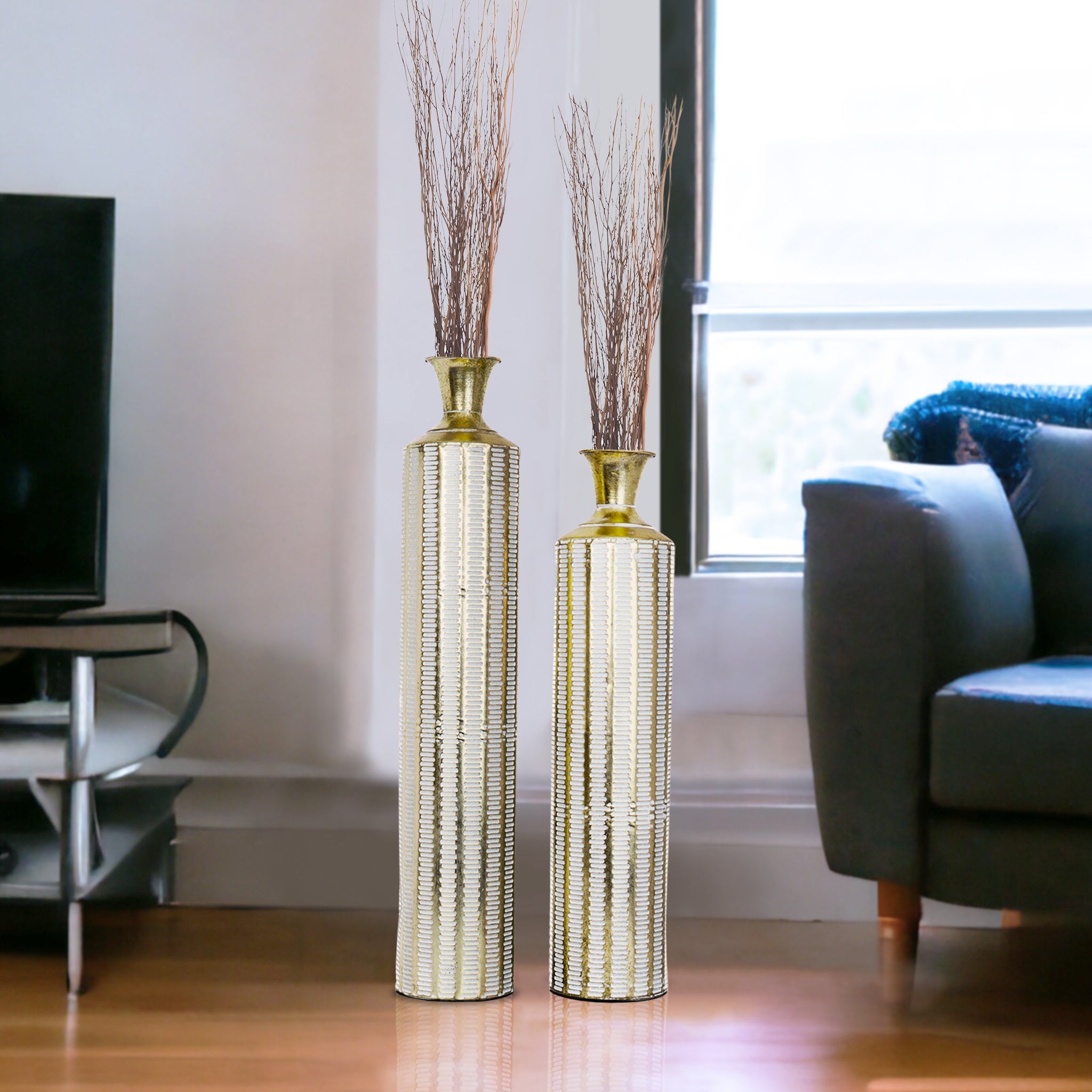 2 Piece Large Tall Rustic Metal Vases, Golden White Distressed, 33 and 27 Inches