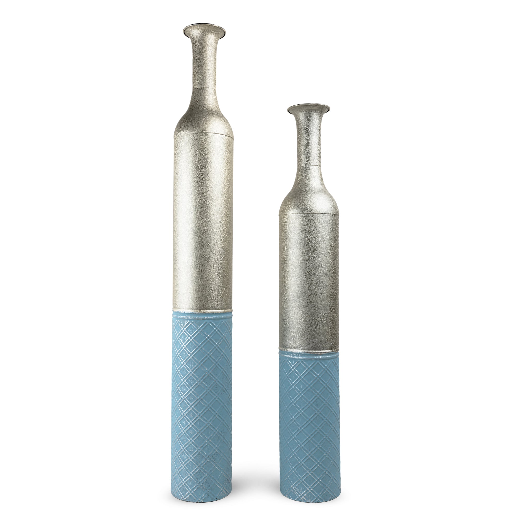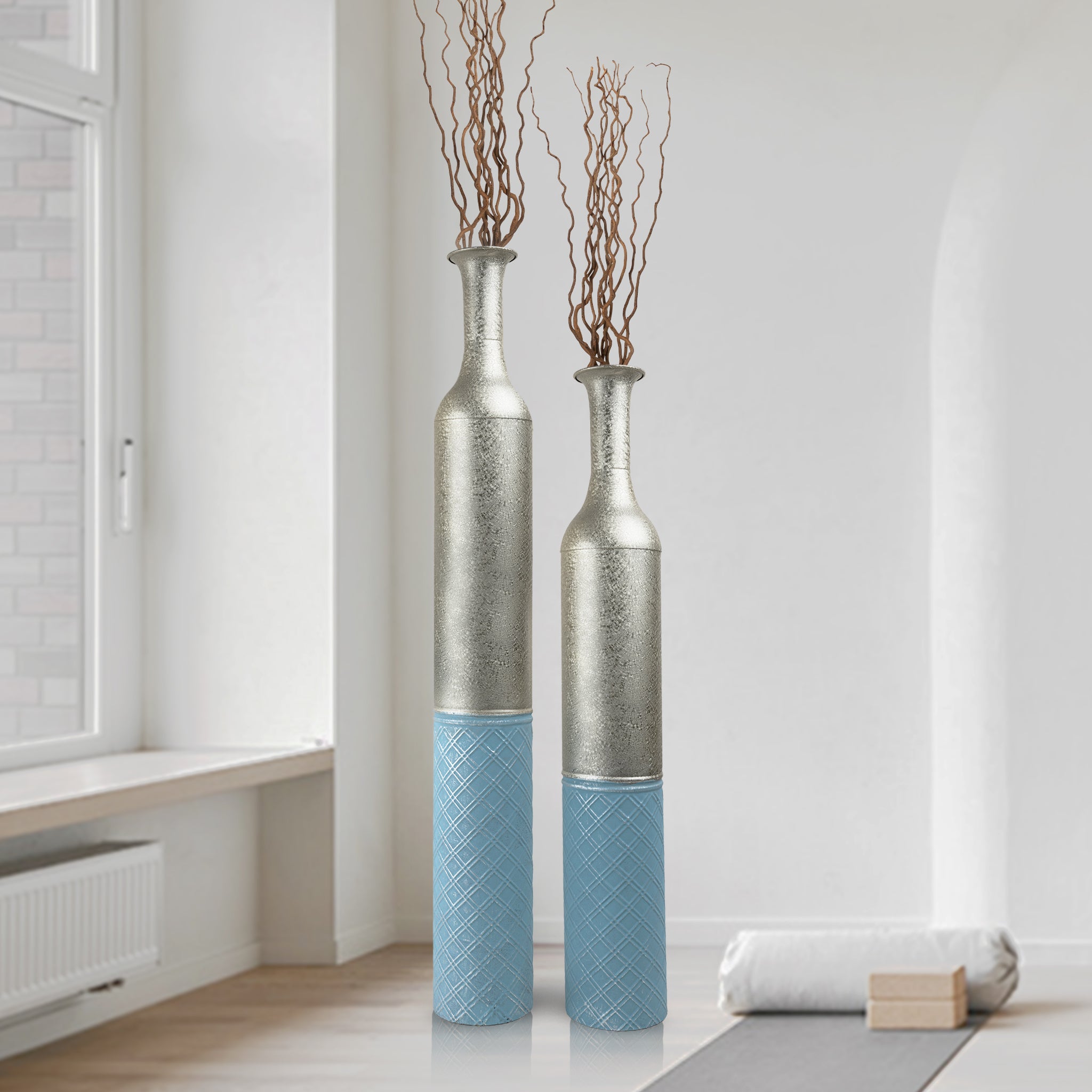 Adorn your floors with this set of rustic tall vases in varying heights for a layered effect. Made of metal, these floor vases are durable and stylish at the same time. Hand painted in silver and blue with geometric pattern and textured surface, these decorative vases match different interior styles from rustic to modern. Decorate with pampas grass, decorative dry willow branches, sunflowers, or any fake or fresh floral arrangements depending on the celebration or event for added charm. The metal vases are also perfect on their own even without flowers or greens. Large and impactful, they can create a twist in your decor - ideal indoor decor for home, office, hotel lobby, porch, resort, restaurant, and more!