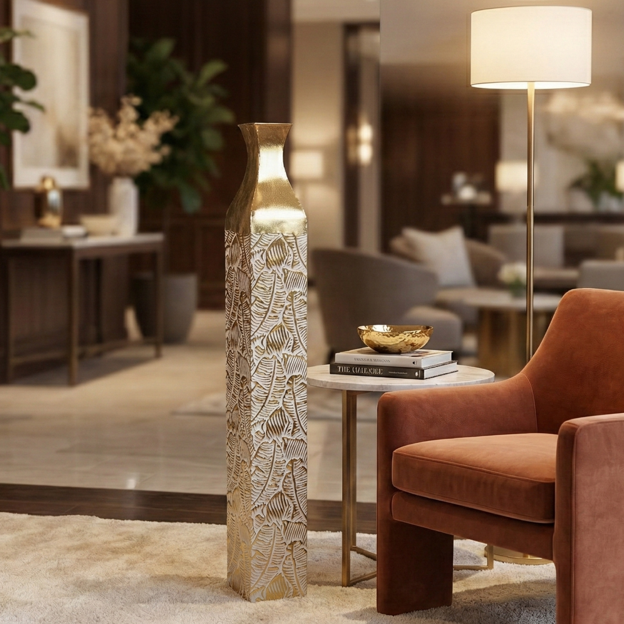 We all want our living spaces to feel warm and fancy at the same time. That's where this Gold Tall Vase for Living Room comes in handy! This rustic weathered finish handmade large gold floor vase is super stylish and easy to use, made of metal, and has a standout pattern. This big 36 inches tall vase can be filled up with your favorite flowers or branches, or leave it empty for a classy minimalist touch. This gold metal flower vase is built to last, so you can enjoy it for a long time. A great addition to any room - from traditional to modern, farmhouse to boho chic. This metal flower vase is great as foyer decor, decor for entryway, or centerpieces for your entrance way ideas and floral arrangements ideas.