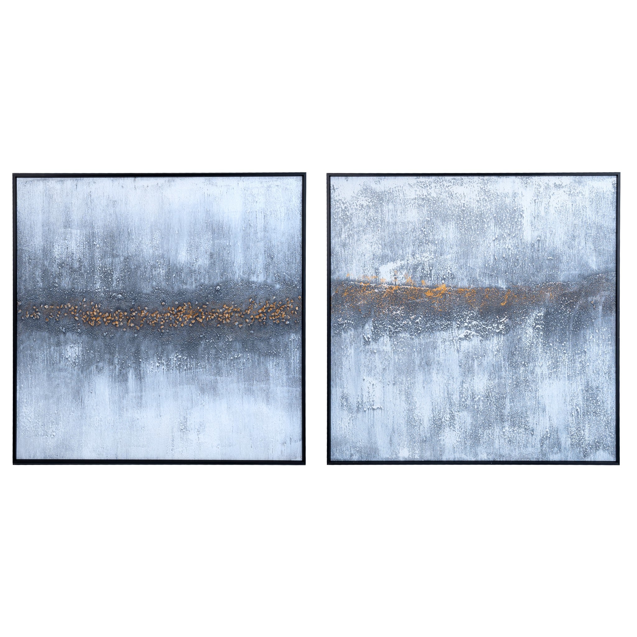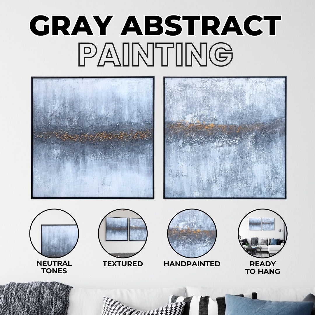 This 2-piece Gray Light Textured Abstract Painting is an artistic and tranquil addition to your living room decor. Crafted on high-quality canvas with a wood frame, it features calming white, grey, and gold tones, blending seamlessly into any decor. Perfect for the living room, office, or master bedroom, it serves as striking above bed wall art or a statement piece over the fireplace. Its minimalist design enhances its abstract appeal, ideal for those seeking large artwork and a neutral home decor aesthetic. Handmade and elegant, it's perfect for dining room or kitchen wall decor, effortlessly transforming your space.