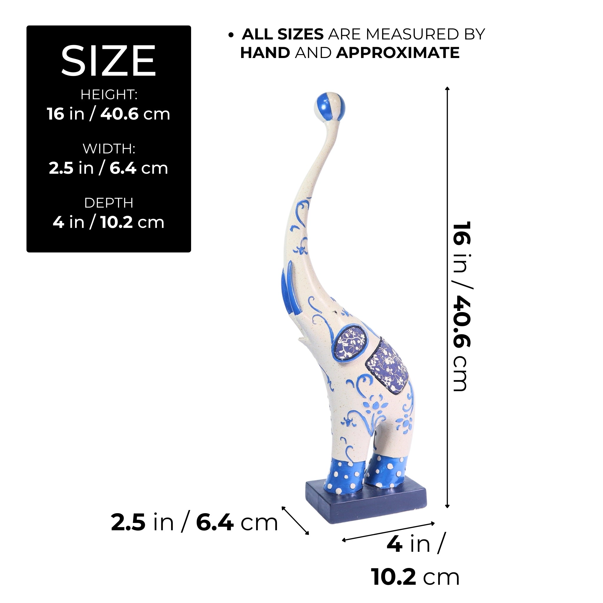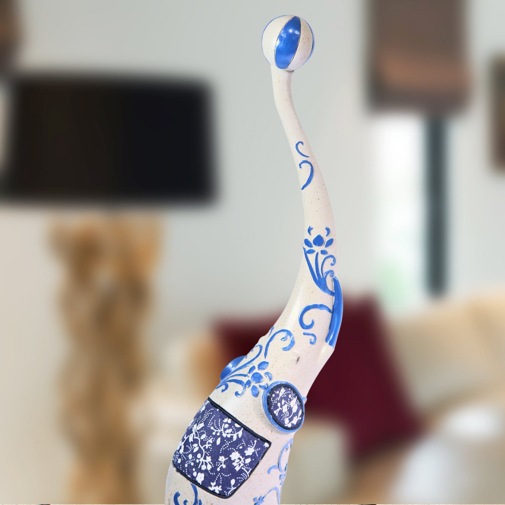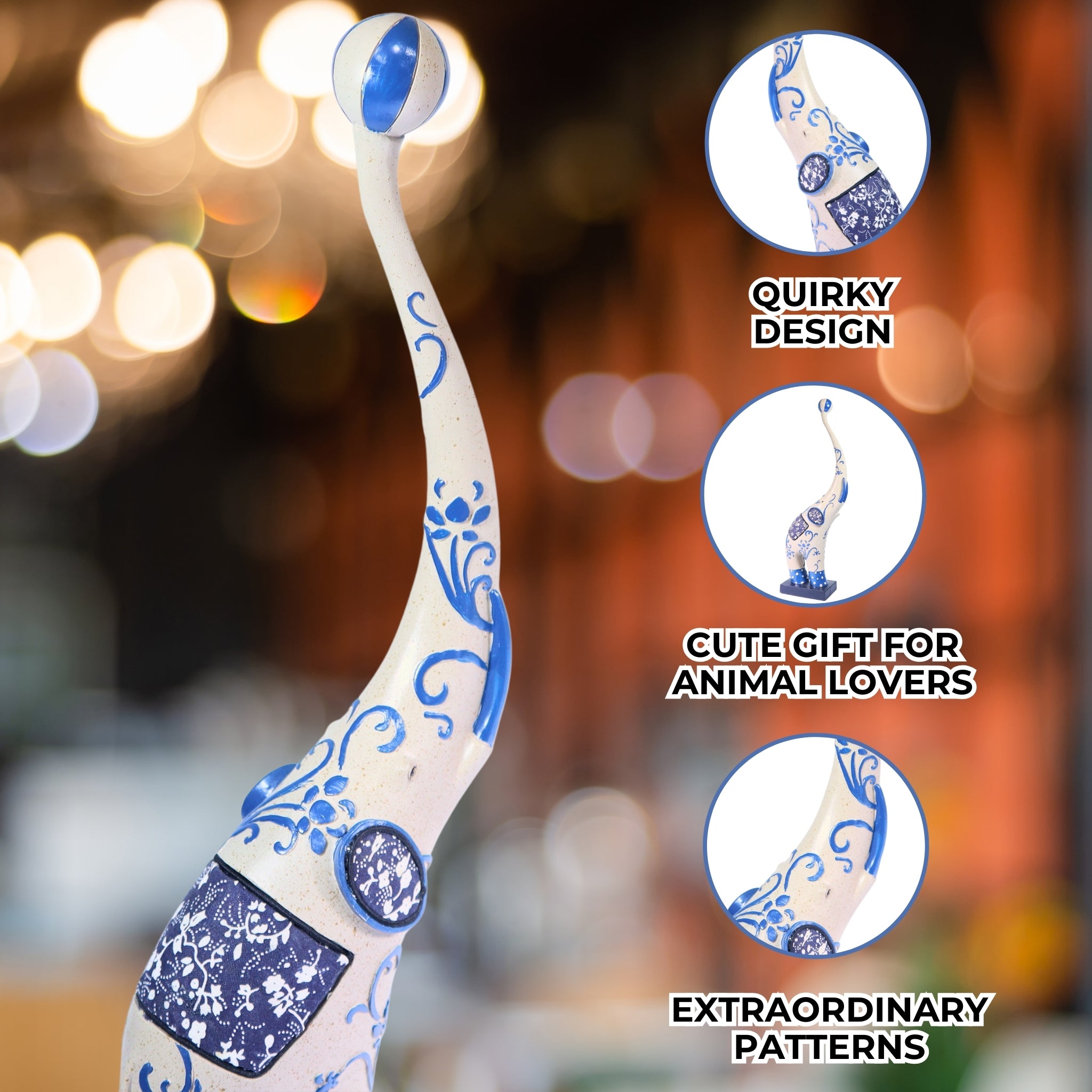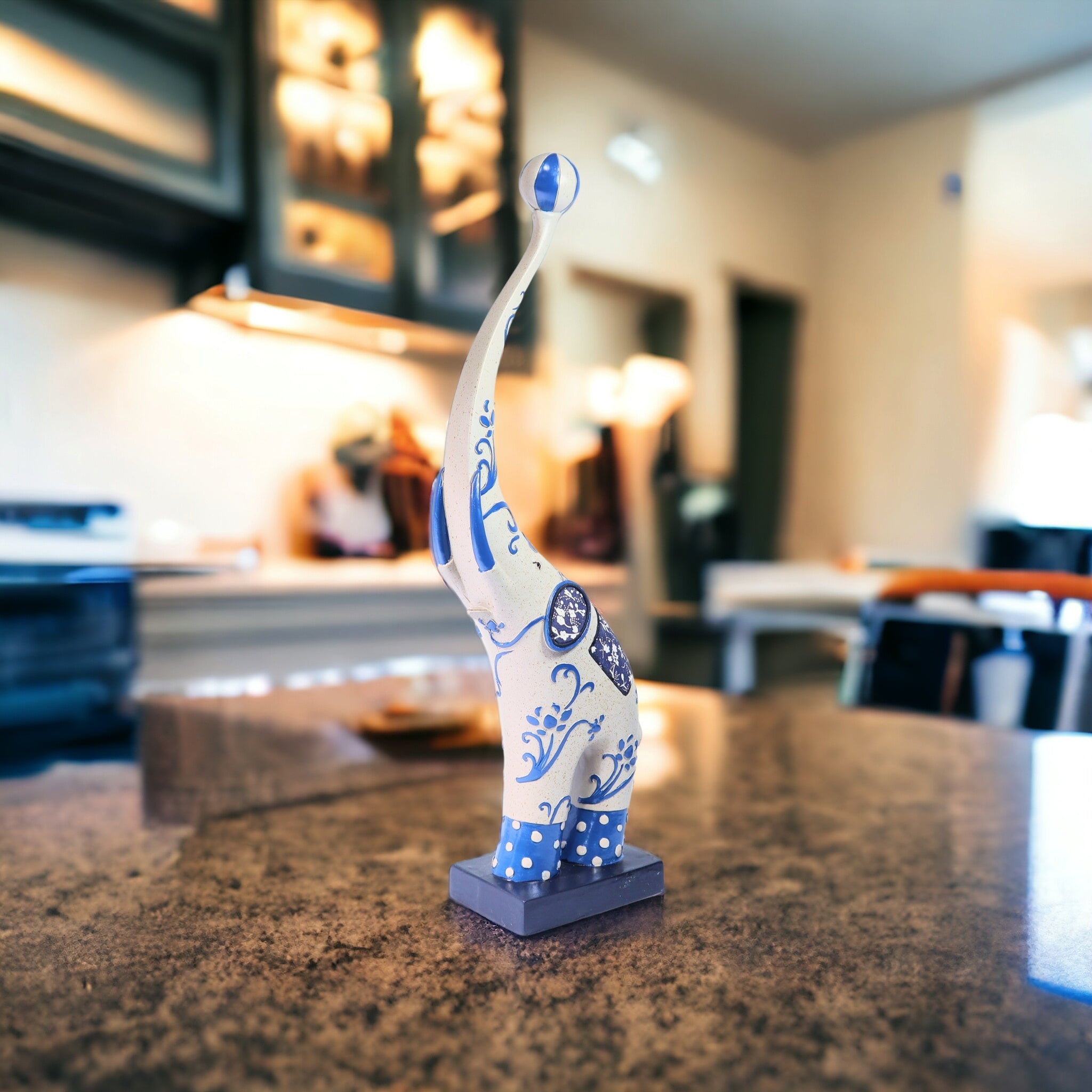 Create a playful environment in your home or office with this Circus Elephant Statue Decor. As a tabletop centerpiece, this elephant sculpture is a cheeky sight. With the whimsical blue details added to the white finish of the elephant sculpture anyone will appreciate the creative process behind it. This means that you'll have a unique piece of art decor, which you can use as an element to your foyer decor ideas, a unique console table ornament, cute bookshelf decor, interesting office cubicle decor, or a welcoming entryway table decor. The list goes on as to how or where you'd want to adorn this elephant statuary. With just the right size, it's perfect for compact spaces, such as dorm rooms, tiny houses, condos, and apartments. On top of it all, this animal statue is also great as gift for art enthusiasts and animal lovers.