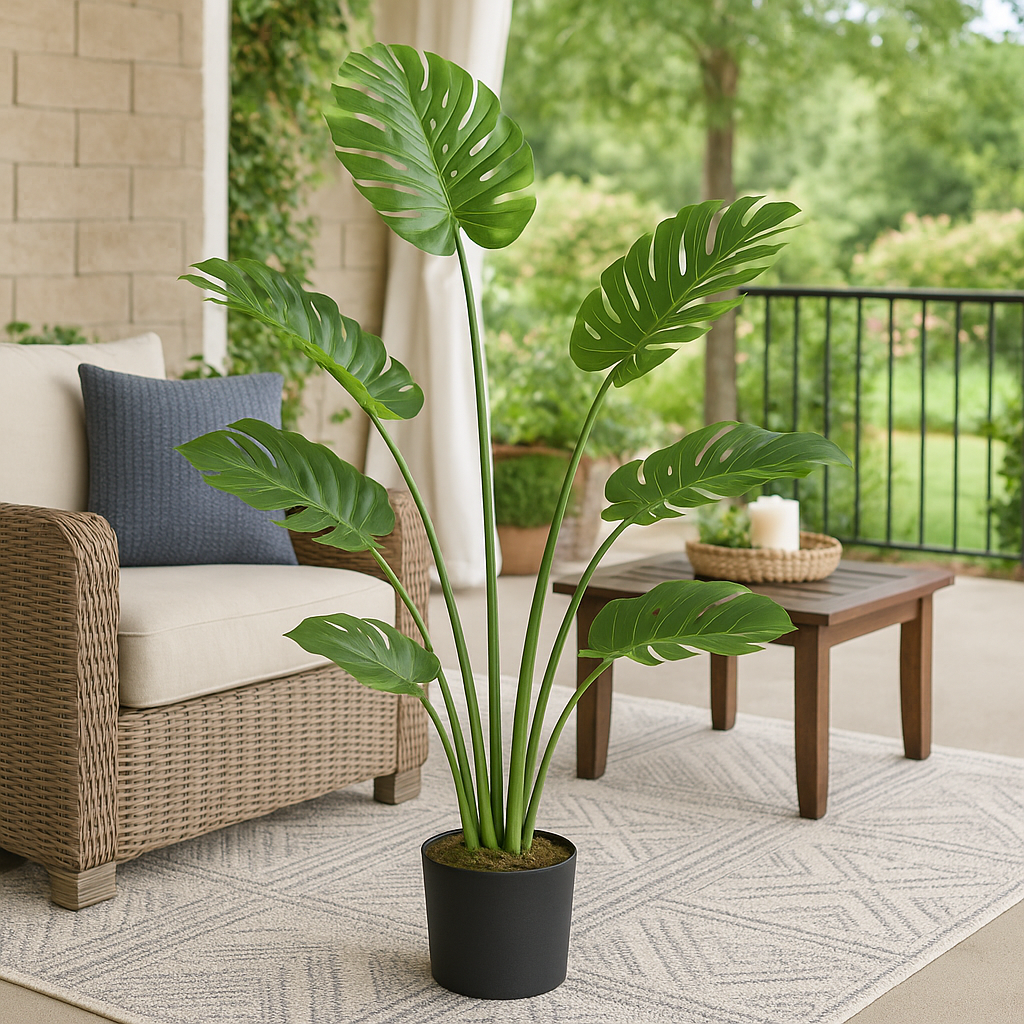 Bring lush, tropical vibes to your space with this Large Artificial Monstera Plant. Standing 120 cm or 47 inch tall, this realistic faux botanical adds a bold splash of greenery without the maintenance of a real plant. Whether placed on your patio, front porch, terrace, or inside your home or office, this lifelike decorative plant is perfect for elevating your home, office, or business space. Ideal for indoor decoration, it's a wonderful gift for plant lovers or anyone wanting a touch of the tropics - minus the watering. NOTE: If you wish to use it outdoors, spray with UV resistant spray to protect against harsh weather and UV rays.