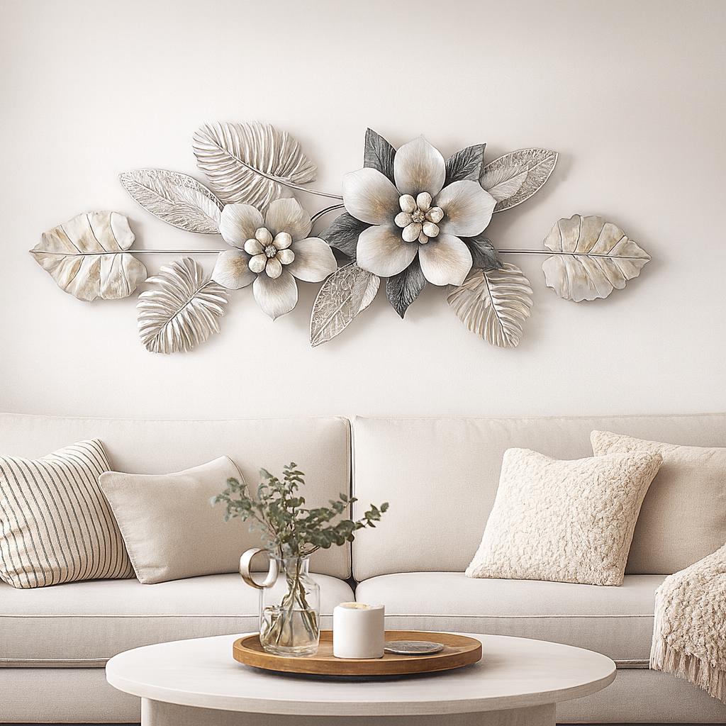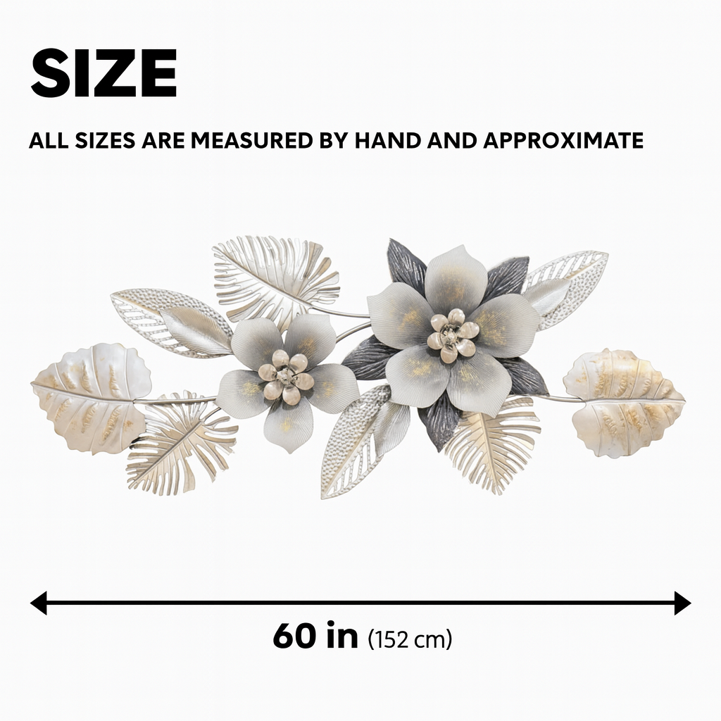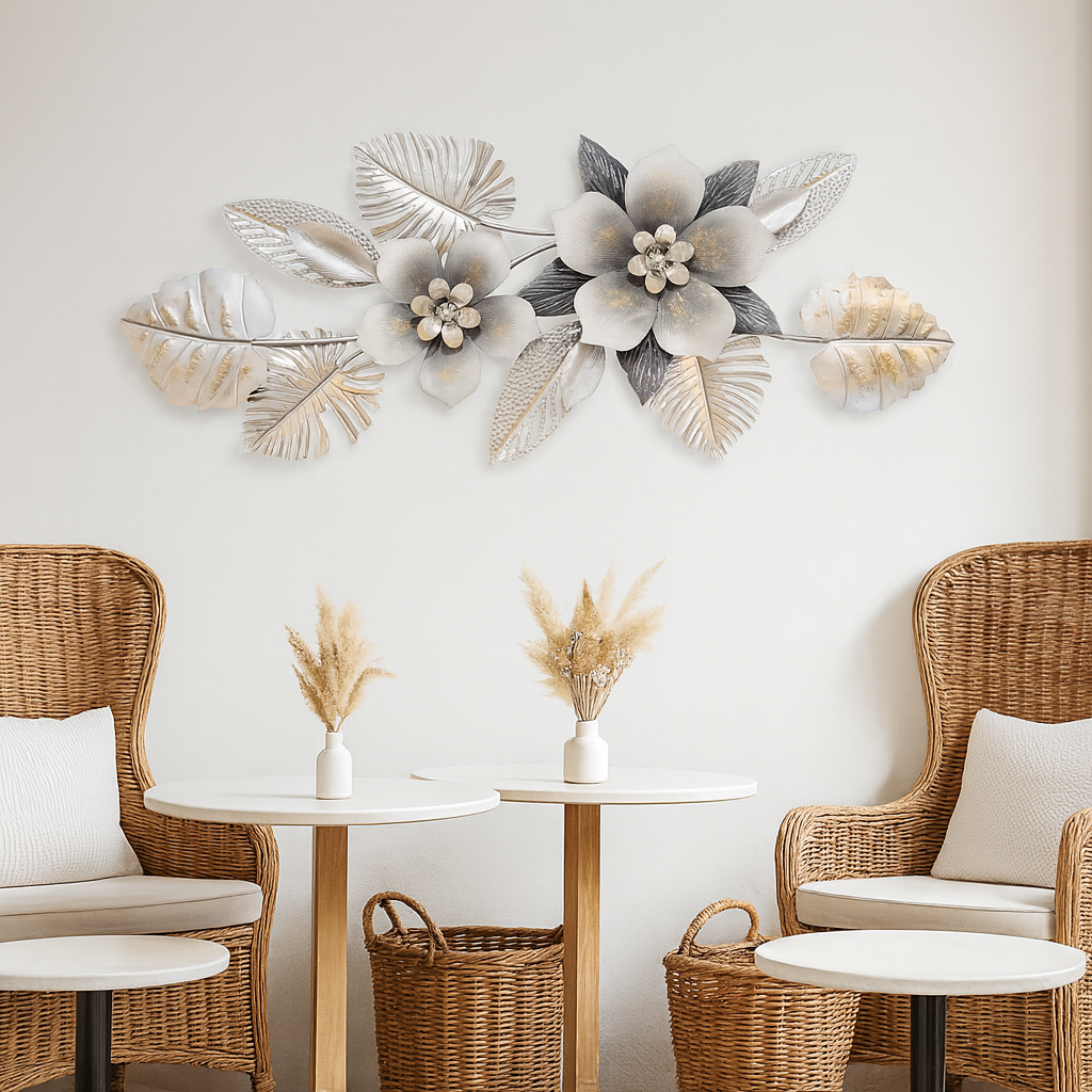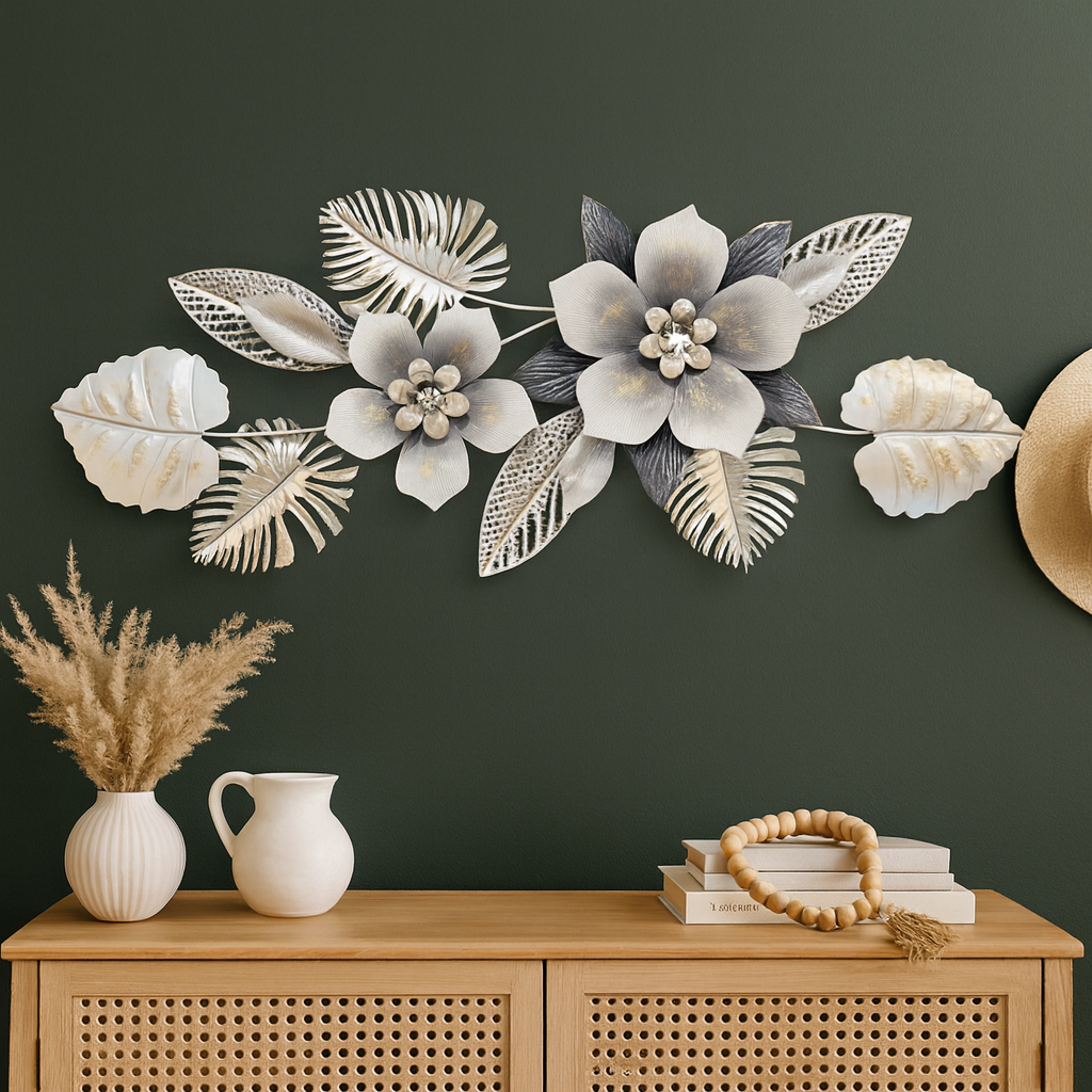 Bring nature into your your home's interior with this exquisite Large Metal Flower Wall Art. This stunning 3D wall sculpture captures the beauty of nature with a sophisticated, modern twist. Featuring two intricate, oversized flowers and a cascade of detailed botanical leaves, this piece is a true statement piece for any room. The elegant design combines textured silver, deep gray, and subtle champagne-gold accents, creating a captivating visual effect that plays with light. The layered construction gives it a dynamic 3D quality, making the flowers and leaves appear to float off the wall. This modern botanical decor is meticulously crafted from durable metal, ensuring it remains a timeless centerpiece in your home for years to come. Perfect as living room wall decor, a serene addition to your bedroom, or a welcoming entryway wall art piece, its versatile style complements contemporary, modern, and even glamorous aesthetics. Bring a touch of nature-inspired luxury to your space with this unique metal wall hanging.