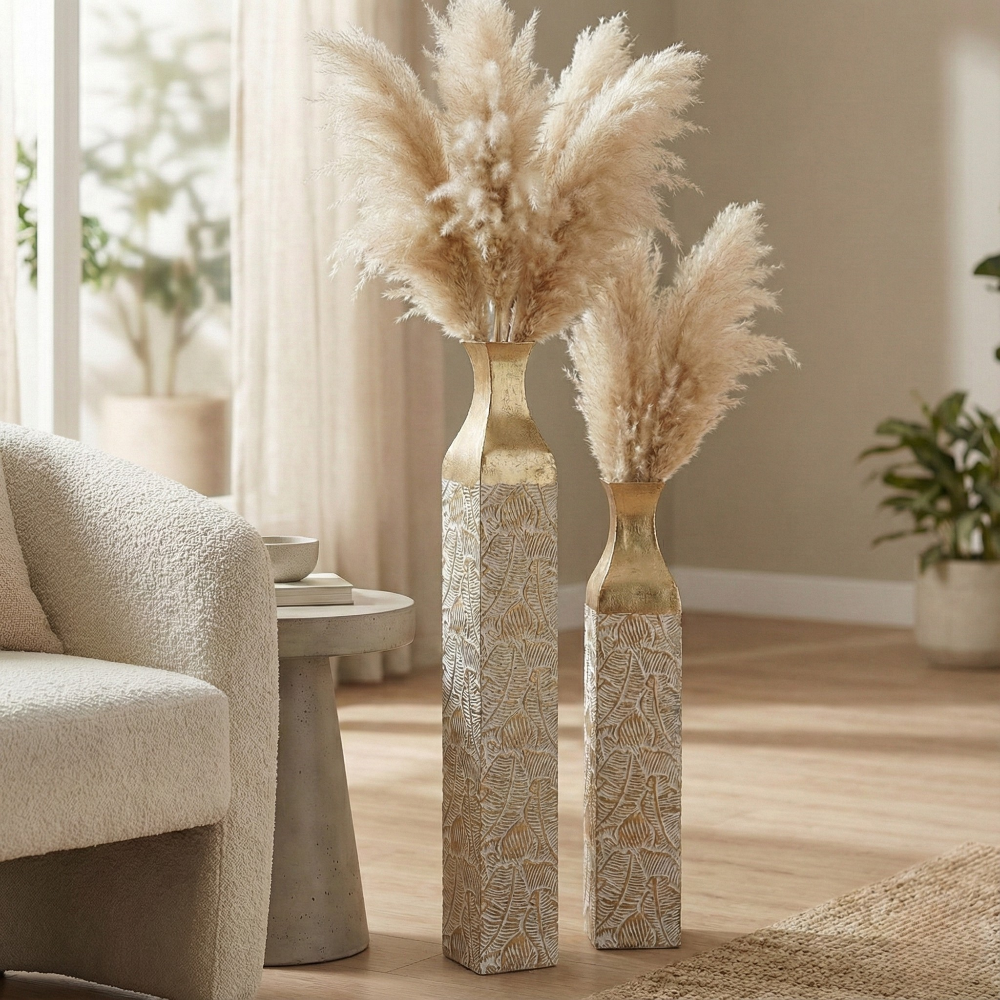 We all want our living spaces to feel warm and fancy at the same time. That's where these rustic weathered finish handmade Gold Tall Vases for Living Room come in handy! Each gold floor vase is super stylish and easy to use. These decorative vases are made of metal with a standout abstract pattern. Display these luxury vases together or separately in different rooms for a coordinated look in your interior. Fill these large rustic vases up with your favorite flowers or branches, or leave them empty for a classy minimalist touch. These gold metal flower vases are built to last, so you can enjoy them for a long time. They're a great addition to any room - from traditional to modern, farmhouse to boho chic. Great as foyer decor, decor for entryway, or centerpieces for your entrance way ideas and floral arrangements ideas.